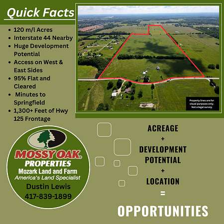 Prime location with unparalleled accessibility, this expansive 120-acre property offers vast opportunities for large-scale developments. With entrances conveniently situated on two different roads, the land is designed to accommodate diverse projects. This property has over 1,300' of Highway 125 frontage enhancing visibility and convenience. Situated close to Interstate 44 ensures easy connectivity to a major interstate. This property stands out as a versatile canvas for visionary developers and offers an exceptional opportunity for developers seeking prime land with outstanding accessibility and versatility.