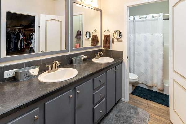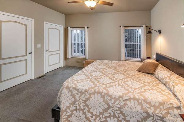- Breakfast Bar, Ceiling Fan(s), Double Vanity, Fiberglass Stall Shower, Open Floorplan, Pantry, Primary Downstairs, Shower/Tub Combo, Solid Surface Counters, Walk-In Closet(s)