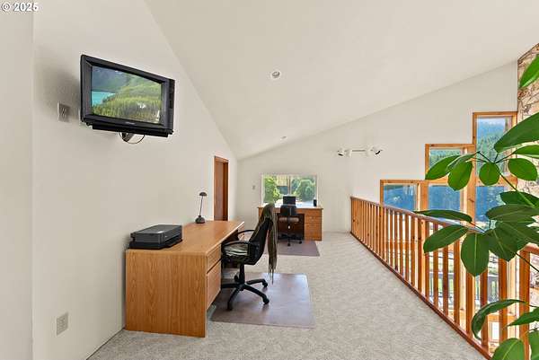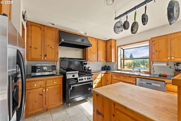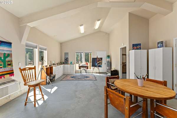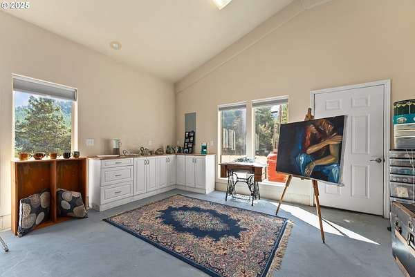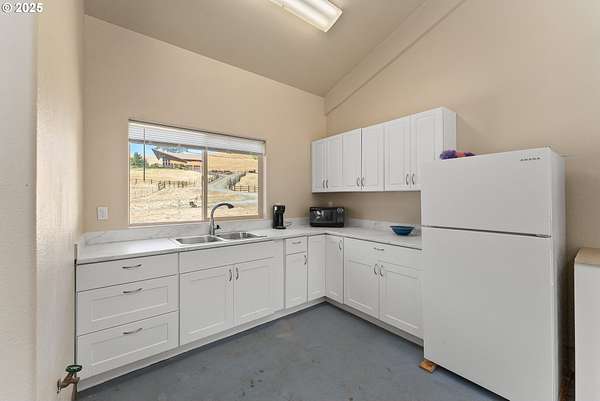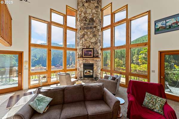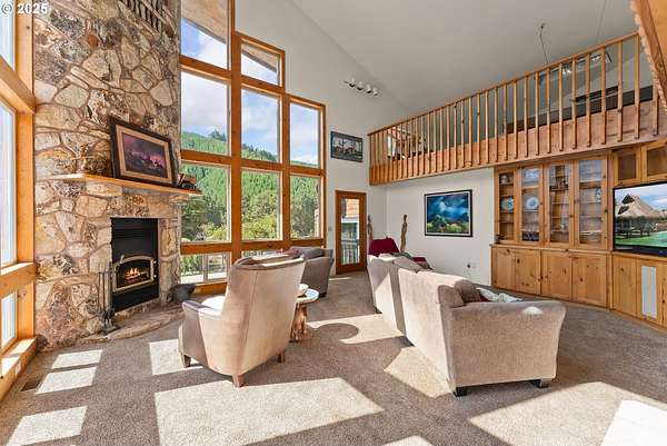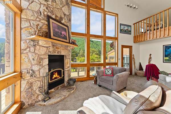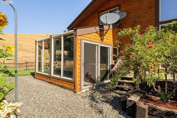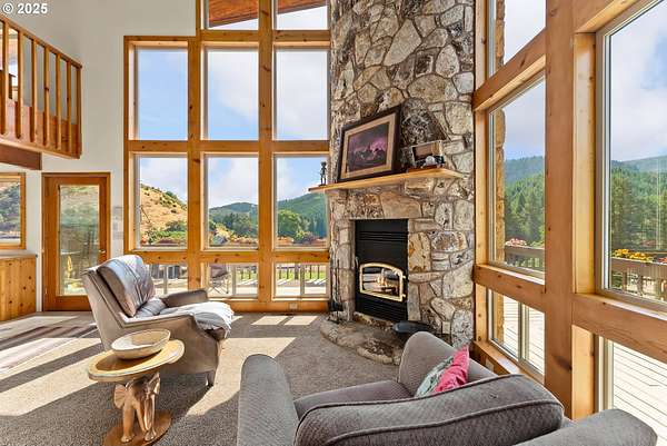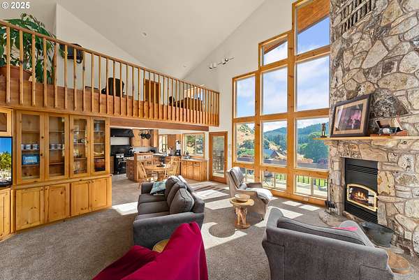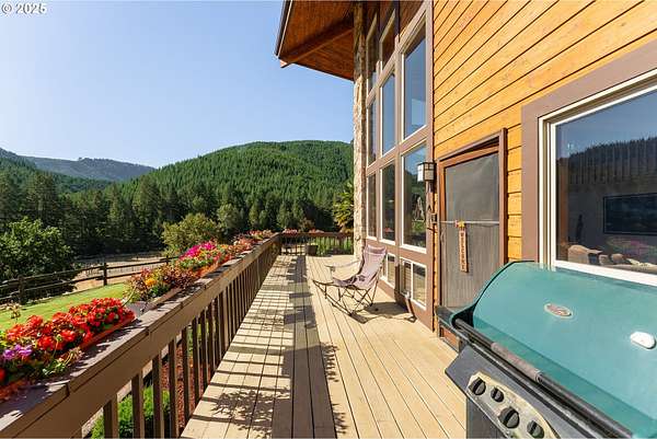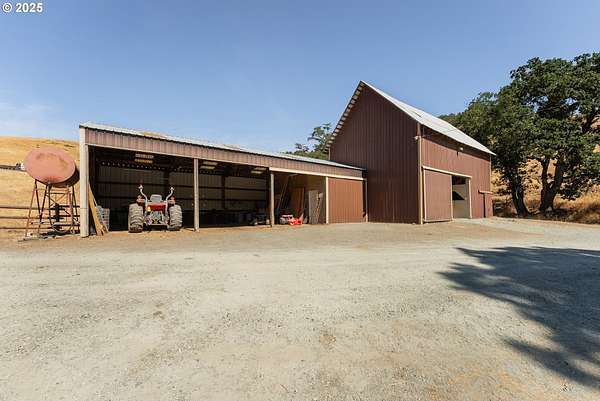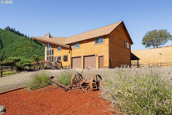 This working Ranch is an Oregon Valley Sanctuary all it own. This exceptional custom-built ranch home sits on approximately 357 acres and is nestled in a valley with panoramic views of the hills, sunrise and sunset. Built in 1994, this one-owner home blends rustic charm with modern comfort. Grand 24' ceilings with a floor-to-ceiling river rock fireplace, and large windows that flood the living area with natural light while framing scenic views. The warmth of the fire and panoramic views are sure to warm the soul at anytime of the year. The kitchen boast a Gourmet Wolf propane stove, island, granite countertops and tile flooring. Upstairs you will find a large area to make into your game room, office, workout or entertainment area. There are two bedrooms, a bath and an office with plenty of storage throughout. Located on the main floor is the primary bedroom with a walk-in closet. From the primary bedroom you can enjoy your own private entrance to the solarium that hosts a hot tub for relaxation and enjoyment with views of the hills. The large two car garage offers lots of room for parking with an additional storage room, a covered carport, and room for RV parking. A solid concrete floor ADU has a private bath, kitchenette and ductless system. Make this studio yours for your next project, guest quarters or hobby room. A three bay machine shed with an enclosed one bay shop with 220W, two stalls with matts, tack room and grain room. Above the stalls and tack room there is ample room for storing hay or whatever you may need to stay dry. An approximately 100X200 arena with roping chute and catch pens sits down by a year round creek. Property is fenced for cattle and goats. A barn for the goats sits on the west end of the property. Currently there are approximately 250 goats and a handful of cows.