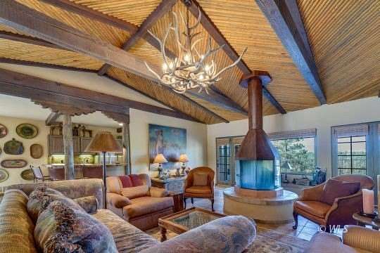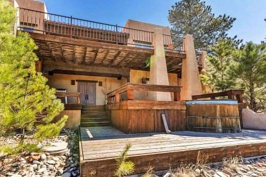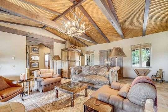 Nestled along peaceful GRAPE CREEK and spanning 44 breathtaking mountain acres, this custom stucco Spanish-style home offers gracious living in an extraordinary setting framed by magnificent Sangre de Cristo MOUNTAIN VIEWS. Designed for refined mountain living, the residence showcases beautiful wood beams, lodge pole pine vaulted ceilings and impressive 10-foot ceilings that create warmth and architectural character throughout.The main level features two spacious bedrooms and two bathrooms, along with a gourmet kitchen appointed with dual gas stoves, tile countertops, and rich hardwood floors. The inviting living room centers around a perfectly placed round wood burning fireplace and opens to a back deck where sweeping views provide a stunning backdrop for relaxing or entertaining.The lower level includes a bunk room and an elegant entertainment room complete with a wet bar and wine storage. The three-car heated garage offers an additional 800 sq ft living space above with three comfortable guest bedrooms, a bathroom, and living room. This remarkable creekside estate blends luxury, scenery, and the very finest elements of mountain living.