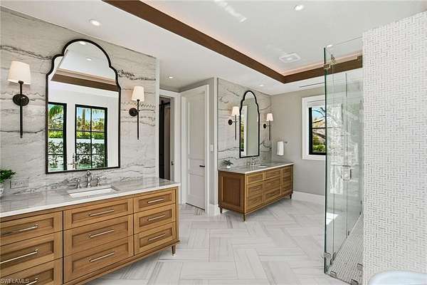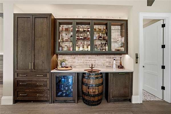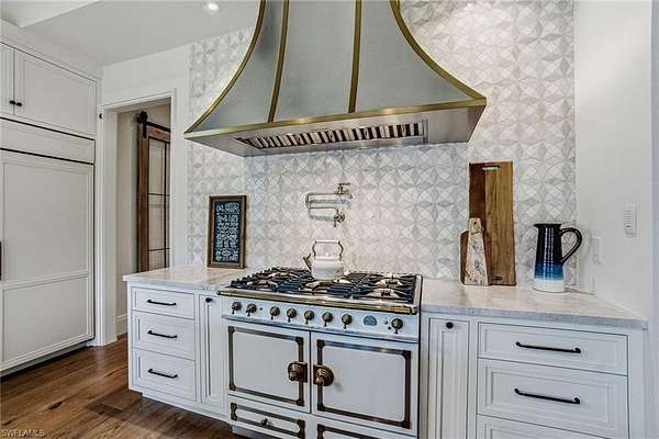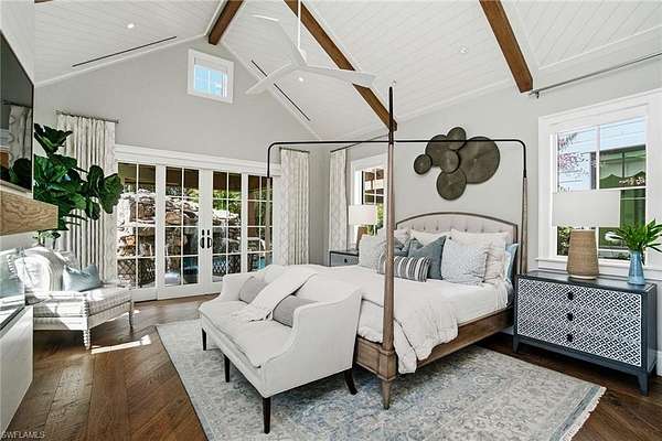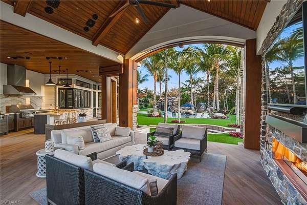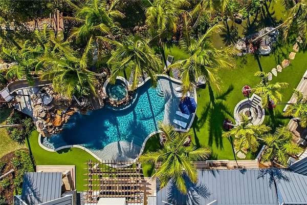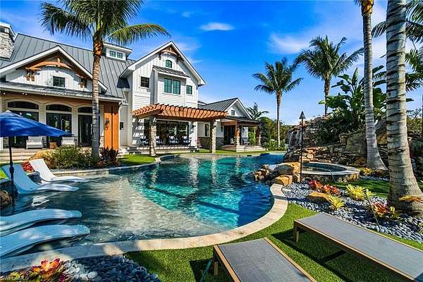 This is a one-of-a-kind Naples riverfront estate set on 3.29 gated acres along the Cocohatchee River with direct Gulf access. Built in 2021, this exceptional property combines expansive waterfront acreage with a nationally recognized, resort-style outdoor environment designed for unforgettable entertaining. The defining feature is the extraordinary Lucas Lagoons backyard, created by Lucas Congdon of Insane Pools. Natural stone anchors a multi-level saltwater pool with spa, waterfalls, fire bowls and waterslide. A propane fire pit, integrated sound system and layered landscape lighting complete the immersive setting, designed to accommodate intimate evenings and large-scale gatherings. Covered outdoor living areas with wood ceilings and a gas stone fireplace connect seamlessly to a fully equipped outdoor kitchen featuring an alfresco grill, hibachi station, leathered quartzite countertops, ice machine and ample prep space. A private putting green and multiple seating areas reinforce the estate's self-contained resort layout along the river. Inside, white oak flooring, exposed beams, and brick detailing create architectural warmth and character. The chef's kitchen is appointed with a La Cornue gas range, dual Sub-Zero refrigeration, quartzite countertops, custom cabinetry, and high-end appliances designed for performance and style. A detached guest house provides additional privacy and flexibility, while expansive garage capacity accommodates up to 10 vehicles with lift capability, ideal for collectors and enthusiasts. Along the riverfront, a private illuminated dock with two boat lifts and two Jet Ski lifts, including a covered slip, offers direct access to the Gulf. In a market where waterfront acreage is increasingly rare, 325 Cocohatchee Boulevard presents the opportunity to own a fully completed, gated estate anchored by one of Southwest Florida's elaborate residential outdoor environments.