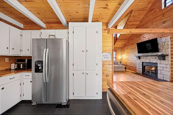 Warm hardwood floors flow throughout the main living areas, leading you to a cozy stone fireplace with gas logs, the perfect spot to unwind on cool Tennessee evenings. The open concept layout is ideal for entertaining and everyday living, highlighted by butcher block countertops and an inviting, functional kitchen.