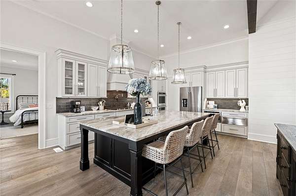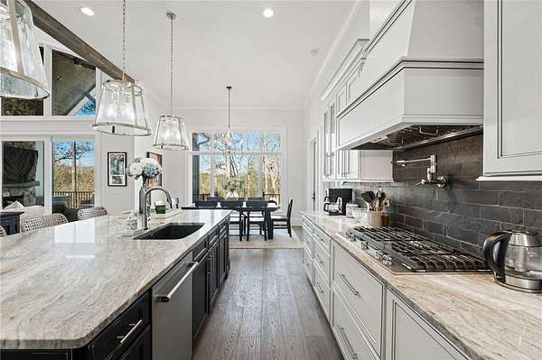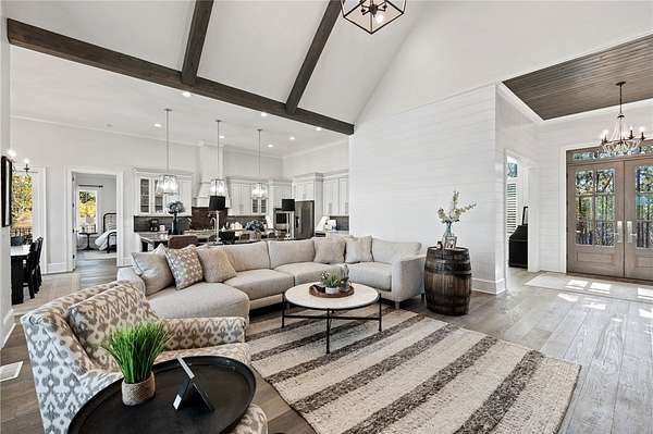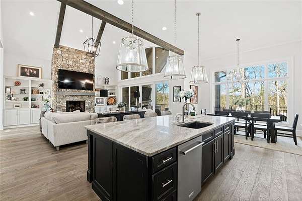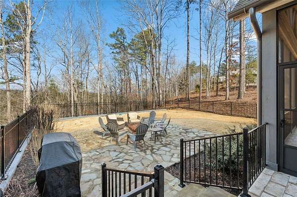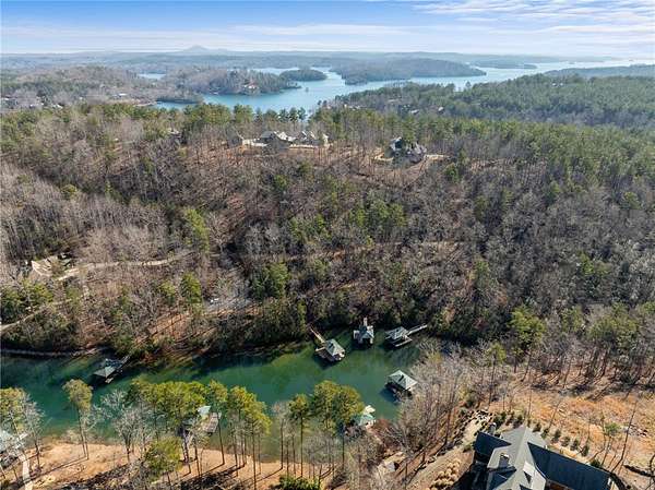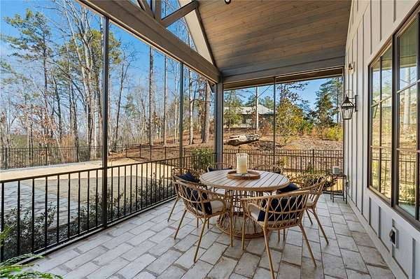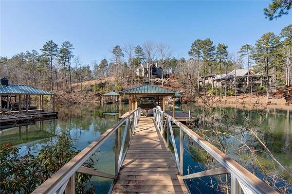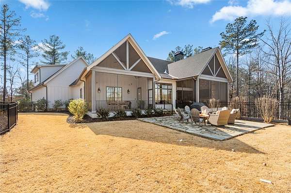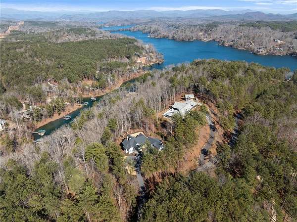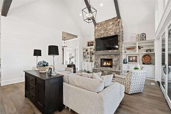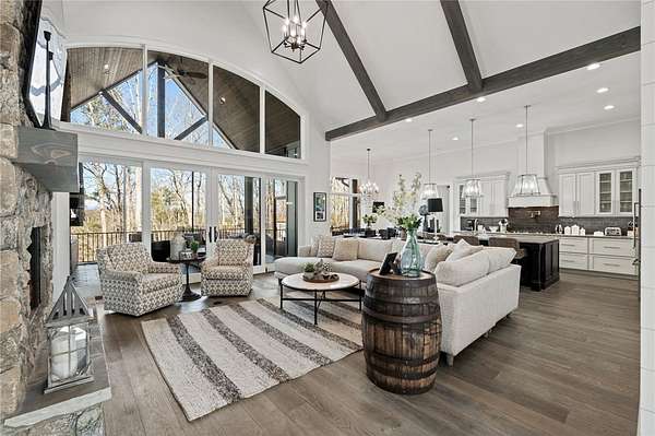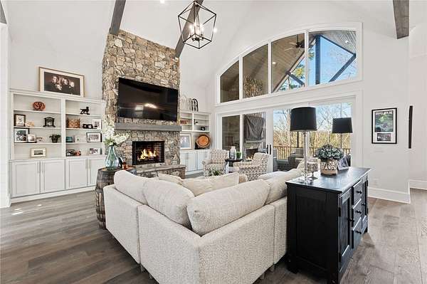 Beautiful sun filled home on private large 1.5 acre artfully landscaped lot (with seasonal broad mountain views) offering convenience, highly desired size, a private covered dock on nearby deeded-waterfront lot, and with turn-key option available including designer furniture. Custom designed, open and bright, this 3,300+ sq ft craftsman 3-4 bedroom, 3 & half bath home with unique and oversized 3+ car garage is in pristine condition. Thoughtfully designed with both the owner's suite and a second guest suite on main level, a warm and welcoming study, open living plan featuring a 9' kitchen island, dining area, family living area vaulted beam accented ceilings to 25' and stone fireplace with gas logs. The home is filled with extra-large windows and 10', 12', and 25' ceilings providing illuminating natural light throughout and artfully adorned with beautiful lighting including Boston style lanterns and other fixtures. The vaulted great room spills onto 2 separate screened outdoor dining and entertainment areas including woodburning stone fireplace w 60" TV overlooking the fenced level rear landscape, expansive stone patio and grill area perfect for family gatherings. The open kitchen features a 9' granite top island w/ seating for 4, extensive counter space, top tier KitchenAid appliances, and complemented with large walk-in pantry and bar area featuring 2 wine chillers and ice machine. The master suite features a broad view of the rear landscape (mountains and lake cove in winter), a warm welcoming master bathroom featuring oversized zero-entry shower with multiple shower heads and floor to ceiling tile, standalone soaking tub, and extra-large walk-in closet. The second private guest suite, also on the main level, features dual vanities and zero entry shower with floor to ceiling tile. The 3rd bedroom suite and 4th potential bedroom or bunk room, office or game room are on second level above the garage and share a full bath. There is an additional room off the hallway on that level that could be a workout, hobby or storage room. Giving thought to future and functional needs, additional features include Icynene spray foam insulation for efficiency and sound proofing, fully encapsulated crawl space with dehumidifier, zero entry showers, dual vanities, a whole house generator for backup power, over 1200sqft of garage space, an insulated and finished poured-concrete construction safe storage room with escape access, storage areas and expansive parking. The deeded waterfront dock parcel is an easy walk or golf cart ride 1/2 mile away on the same street and features a boulder walled walkway, seating area, lighting, new covered dock with lift, and easy climb swim ladder. Located in the heart of the community just over 1/2 mile from the exit gate to Nimmons Bridge Road for easy access to shopping and dining and within 2 miles to the Falls clubhouse and community amenities.