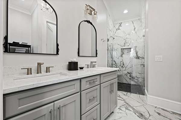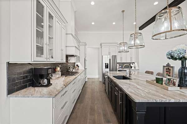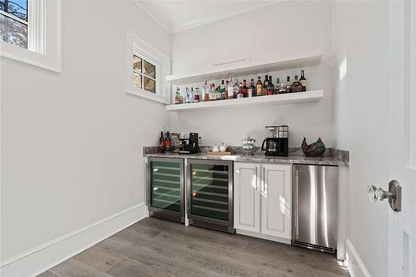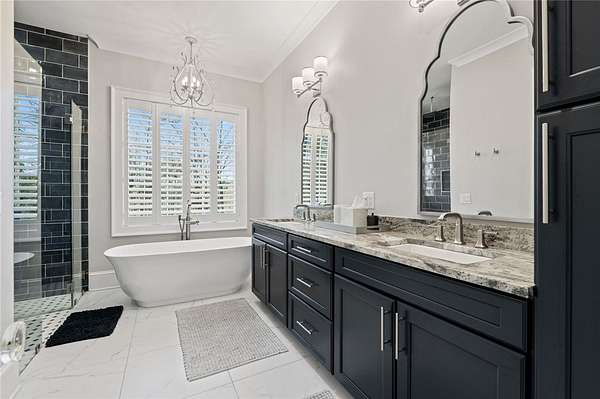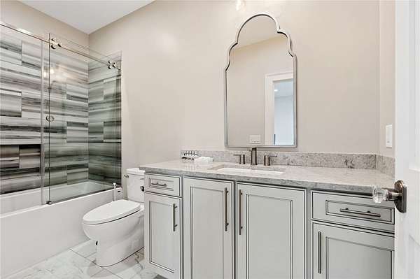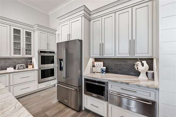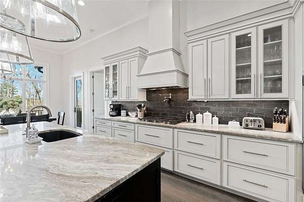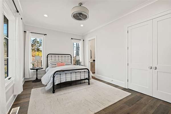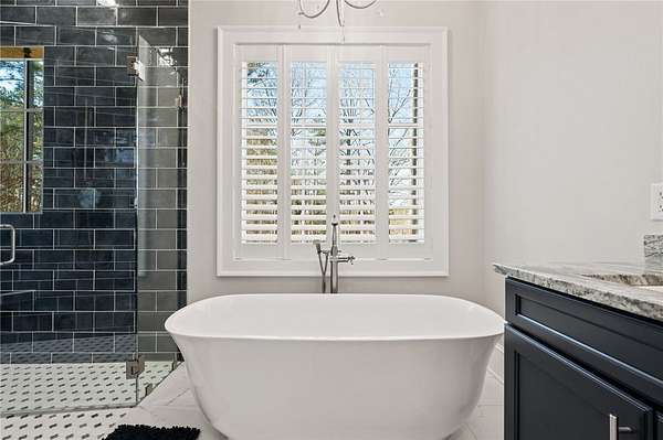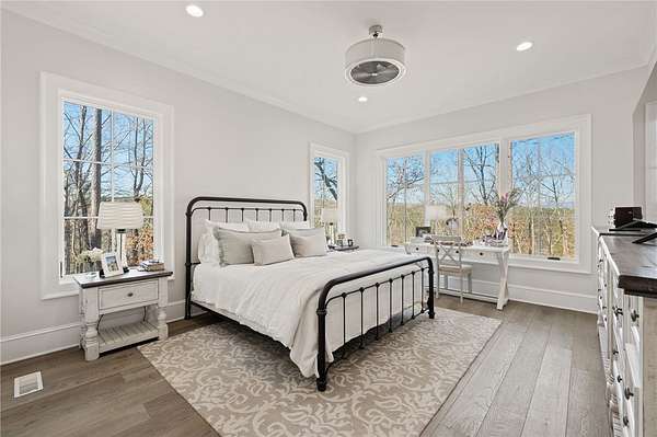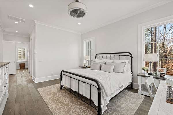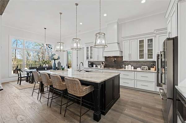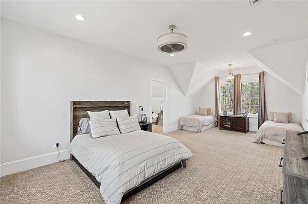 Beautiful sun filled home on private large 1.5 acre artfully landscaped lot (with seasonal broad mountain views) offering convenience, highly desired size, a private covered dock on nearby deeded-waterfront lot, and with turn-key option available including designer furniture. Custom designed, open and bright, this 3,300+ sq ft craftsman 3-4 bedroom, 3 & half bath home with unique and oversized 3+ car garage is in pristine condition. Thoughtfully designed with both the owner's suite and a second guest suite on main level, a warm and welcoming study, open living plan featuring a 9' kitchen island, dining area, family living area vaulted beam accented ceilings to 25' and stone fireplace with gas logs. The home is filled with extra-large windows and 10', 12', and 25' ceilings providing illuminating natural light throughout and artfully adorned with beautiful lighting including Boston style lanterns and other fixtures. The vaulted great room spills onto 2 separate screened outdoor dining and entertainment areas including woodburning stone fireplace w 60" TV overlooking the fenced level rear landscape, expansive stone patio and grill area perfect for family gatherings. The open kitchen features a 9' granite top island w/ seating for 4, extensive counter space, top tier KitchenAid appliances, and complemented with large walk-in pantry and bar area featuring 2 wine chillers and ice machine. The master suite features a broad view of the rear landscape (mountains and lake cove in winter), a warm welcoming master bathroom featuring oversized zero-entry shower with multiple shower heads and floor to ceiling tile, standalone soaking tub, and extra-large walk-in closet. The second private guest suite, also on the main level, features dual vanities and zero entry shower with floor to ceiling tile. The 3rd bedroom suite and 4th potential bedroom or bunk room, office or game room are on second level above the garage and share a full bath. There is an additional room off the hallway on that level that could be a workout, hobby or storage room. Giving thought to future and functional needs, additional features include Icynene spray foam insulation for efficiency and sound proofing, fully encapsulated crawl space with dehumidifier, zero entry showers, dual vanities, a whole house generator for backup power, over 1200sqft of garage space, an insulated and finished poured-concrete construction safe storage room with escape access, storage areas and expansive parking. The deeded waterfront dock parcel is an easy walk or golf cart ride 1/2 mile away on the same street and features a boulder walled walkway, seating area, lighting, new covered dock with lift, and easy climb swim ladder. Located in the heart of the community just over 1/2 mile from the exit gate to Nimmons Bridge Road for easy access to shopping and dining and within 2 miles to the Falls clubhouse and community amenities.