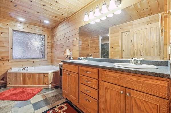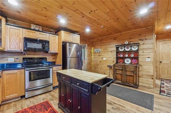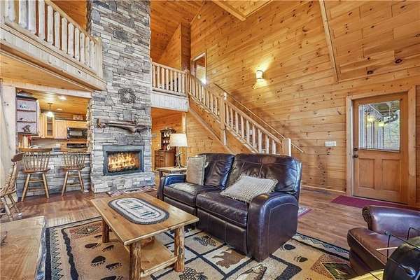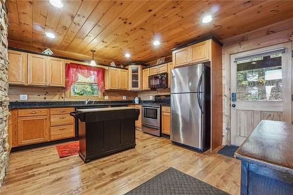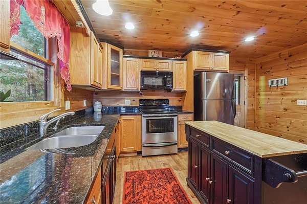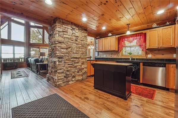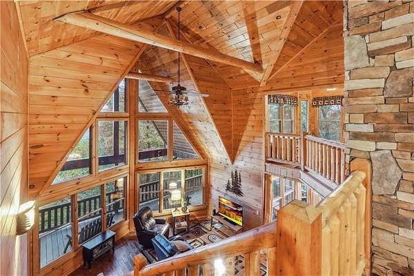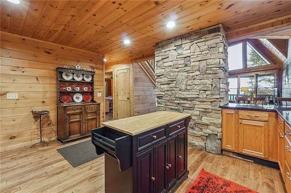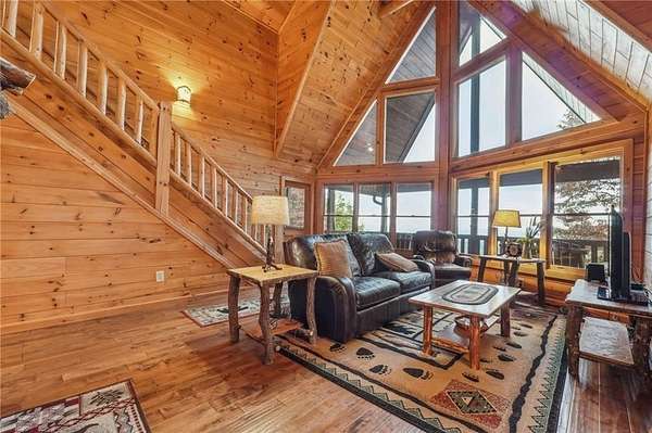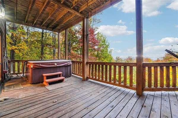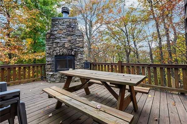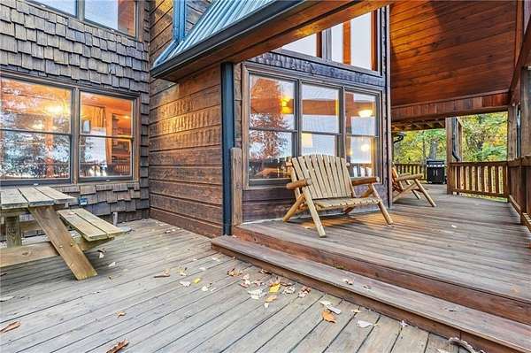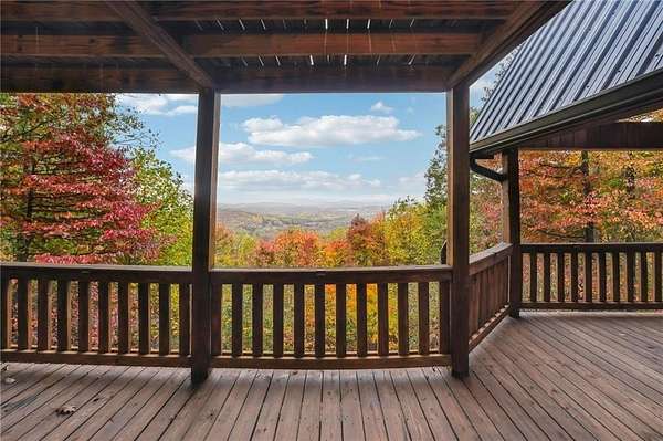 This luxurious mountain cabin home features a modern open-concept design with soaring cathedral ceilings and handcrafted finishes throughout sits on 7.52 acres of land with a massive outdoor stone fireplace and multiple oversized covered decks on all three levels for enjoying the most breathtaking mountain views. Whether you want to relax on one of the three outdoor decks, take a dip in the hot tub, or enjoy some outdoor activities, this peaceful mountain cabin has you covered. As you enter the house, you are welcomed by the floor-to-ceiling wood interior walls and the high vaulted ceilings in the family room with unsurpassed panoramic views of the Blue Ridge Mountains. The kitchen/family room combo is perfect for entertaining. You can be in your gorgeous kitchen, featuring a center island with a butcher's block, stainless appliances, and a breakfast bar, while interacting with family and friends as they relax in front of the massive stone-stacked fireplace or in the cozy breakfast room. There are two oversized master suites with private deck access, walk-in closets, double vanities, and Jacuzzi tubs. The two upstairs bedrooms are oversized with a full bath, loft area, office nook w/built-in desk, and a fireplace. The finished terrace level includes a game room w/ bar area, living room, guest bedroom, full bath, and walk-out deck access to the hot tub. The property also includes a 50-year metal roof on the home, a paved driveway, and a deep well for excellent water quality. Just a short 30-minute drive to the boutiques and restaurants in Downtown Ellijay or enjoy the outdoor hiking trails and river activities at the Aska Adventure Area in Blue Ridge. This mountain home is perfect for a second home or your permanent Vacation!