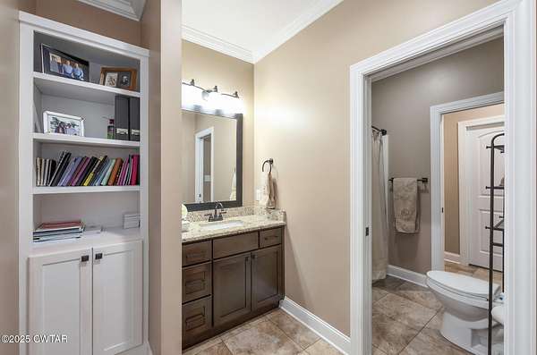 - Bookcases, Breakfast Bar, Ceiling Fan(s), Central Vacuum, Ceramic Tile Shower, Commode Room, Double Vanity, Eat-In Kitchen, Entrance Foyer, Granite Counters, High Ceilings, Kitchen Island, Open Floorplan, Pantry, Soaking Tub, Tub Shower Combo, Walk-In Closet(s)
