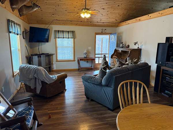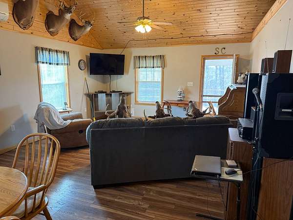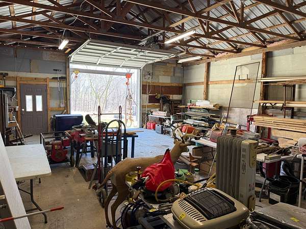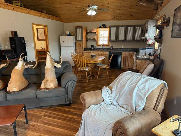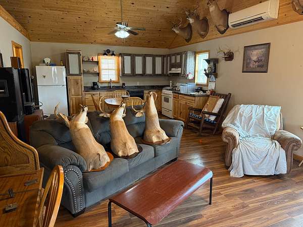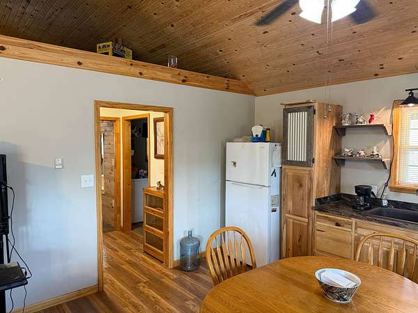 ONLINE ONLY ESTATE AUCTION - ENDS 4/23/2026 AT 6PM WITH SOFT CLOSE Very nice, well-kept home along with a large garage/workshop on 12.8+/- acres in Casey County Kentucky. The house has connection to electric and county water along with a mini-split unit for heating and air conditioning. The home was built in 2018 and features one bedroom and one bath with approx. 896 square feet of living space. Entering the front door leads to the open concept living room/kitchen area with plenty of room for seating and dining table. The kitchen has a stove, refrigerator and dishwasher that will remain with the property along with custom cabinets. With 12' vaulted ceilings the living space feels very spacious and gives off the country cabin vibe. Around the corner is the bedroom with space for a bedroom suite as well has having two closets. There is a full bathroom along with large laundry room at the back of the home as well. The house offers two covered porches, one on both the front and back of the home giving beautiful views of the outdoors as well as areas to see both sunrise and sunset. The garage offers plenty of space for storage as well as room for wood or metal working, mechanical space or etc. There are separate rooms in the garage with the main working/storage area at the front with a smaller room at the back and an additional closed in shed toward the east end of the building. The land is mostly wooded with clearings near the home as well as a food plot for hunting whitetail deer as well as turkey that are both abundant in the area. The driveway is part of the property but also is an easement for the adjoining land owner to access their land. If peaceful, country living is one of your priorities, you have to check this place out.