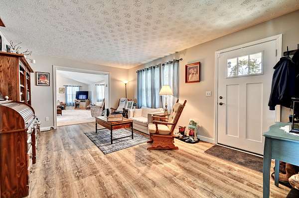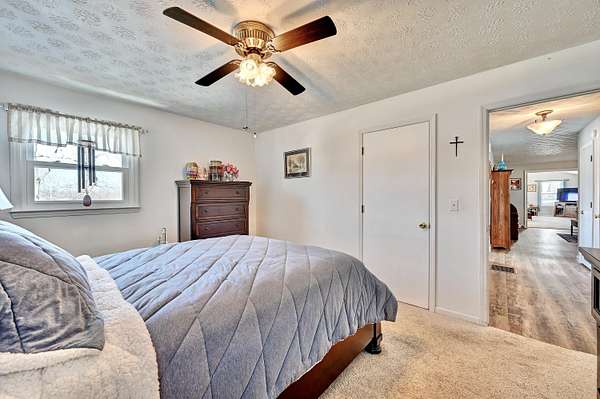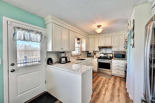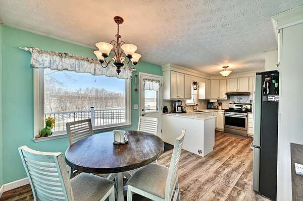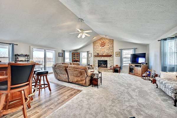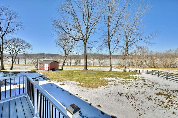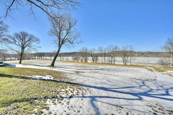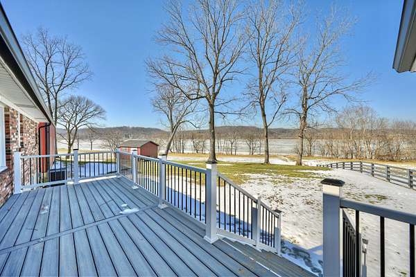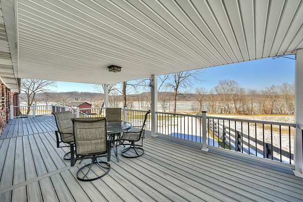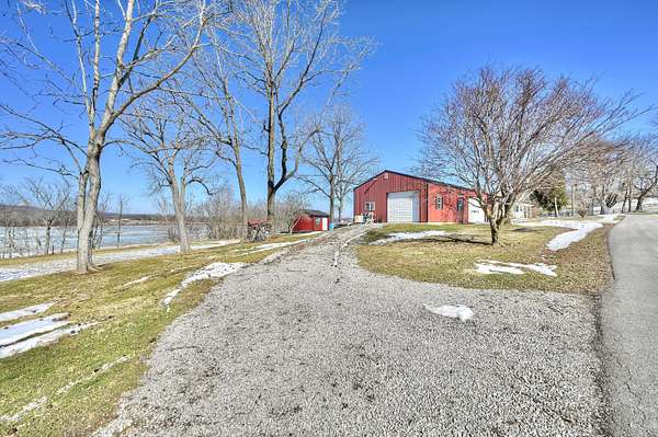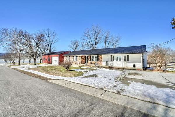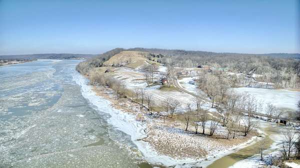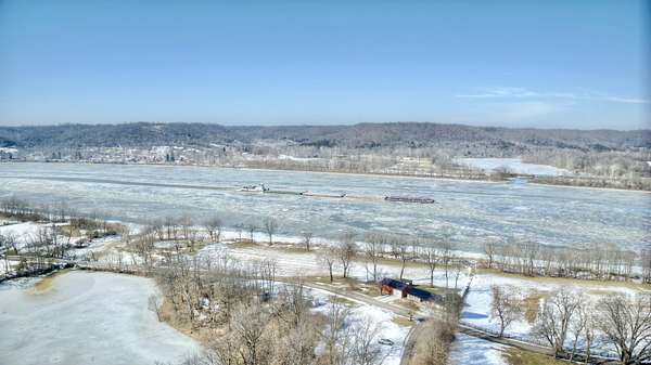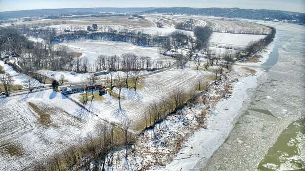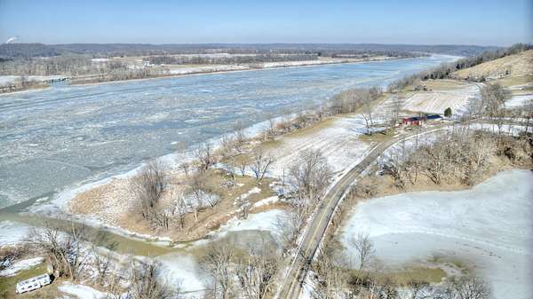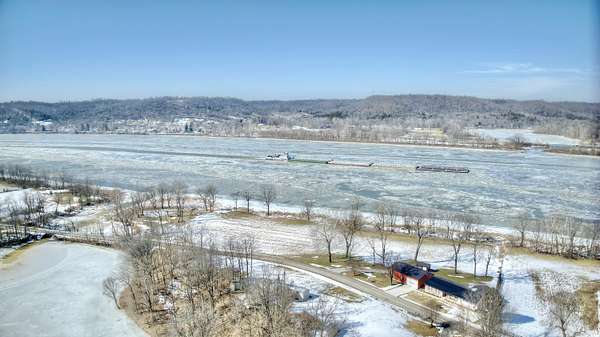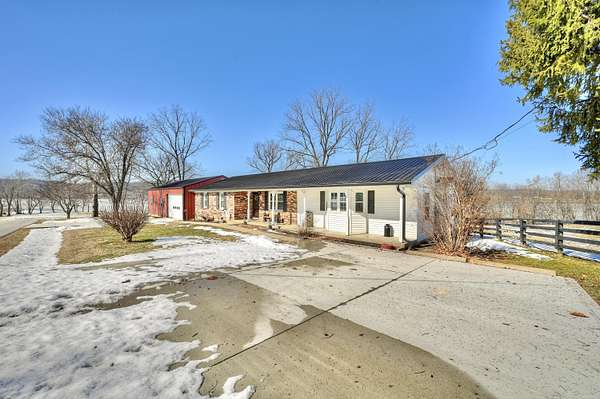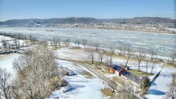 Direct Ohio River frontage with unobstructed water views & convenient access suitable for a private boat dock. Situated on 12.06 acres, this updated 3-bedroom brick ranch offers a private setting with usable riverfront & backwater areas for recreation and camping. Remodeled kitchen includes quartz countertops, stainless steel appliances & walkout to a spacious deck overlooking the massive backyard & river. Oversized family room features cathedral ceilings, a floor-to-ceiling stone gas fireplace & walkout to the covered portion of the deck with panoramic river views. Recent improvements include replacement windows & exterior doors, metal roof with gutters, downspouts & leaf guards, bathroom renovation, updated flooring, Trex decking, concrete sidewalks & driveways & insulated crawlspace with moisture barrier & dehumidifier. Property is connected to city water for added convenience. Additional outbuildings include a large Amish-built detached garage with radiant heat & generator hooked directly to the propane tank, ideal for a workshop & a Weaver Barns storage shed for equipment. Acreage provides open & wooded areas, offering privacy while maintaining access to the river. A rare opportunity for waterfront living with acreage suitable for year-round residence or recreational retreat.
