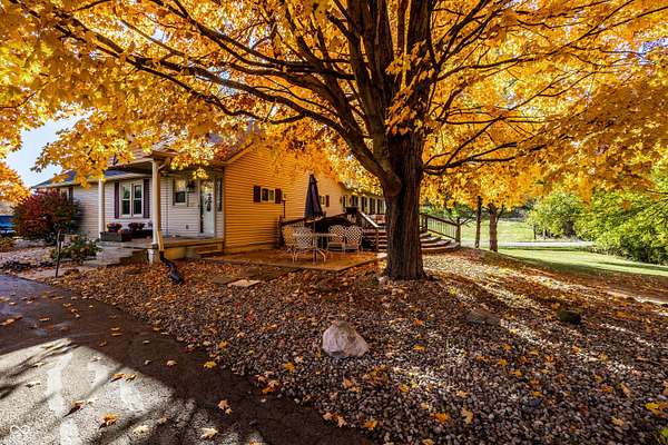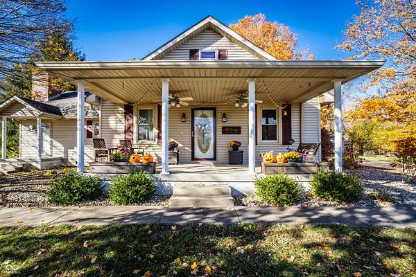 Rural Setting and just waiting on your personal touch! Welcome to this beautifully maintained 3-bedroom, 3-bath, story-and-a-half home setting on nearly 2 acres, offering the perfect blend of space, comfort, and rural charm. This property is ideal for those seeking privacy without sacrificing functionality. Updates include roof 4 years old, dual HVAC systems 2 years old, water softener 1 year old, and an updated deck. The main level features vaulted ceilings in the kitchen and hearth room with a large wood-burning fireplace, creating an open and inviting atmosphere, along with a large family room and a cozy living room perfect for gathering or relaxing. A private office with a gas fireplace, which provides an ideal work-from-home space. The primary bedroom is conveniently located on the main level and features an updated ensuite bathroom. Upstairs, you'll find two additional bedrooms and a full bathroom. The large unfinished basement offers endless potential for storage or recreation. Step outside to enjoy the updated deck with a fire pit, surrounded by mature trees and gently rolling hills, perfect for taking in the peaceful rural setting. Outbuildings truly set this property apart, including a 24x40 pole barn with electric and a concrete floor, perfect for a workshop or garage space. A well-maintained bank barn with stalls and a hayloft adds even more versatility, ideal for hobbies, livestock, or storage. Don't sleep on this opportunity to move to the country! With abundant space inside and out, this property offers a rare opportunity to enjoy country living at its finest while remaining within a sought-after school district.
