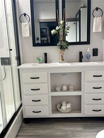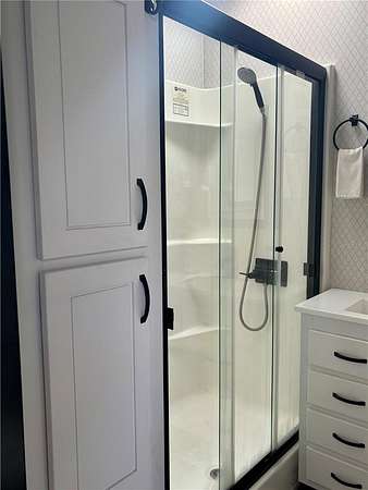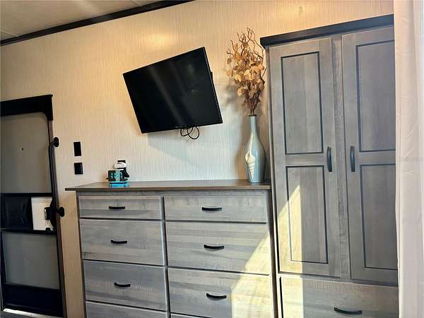 Inside, you'll find a bright and airy open floor plan with luxury vinyl plank flooring throughout. The kitchen is designed for both functionality and entertaining, featuring wood soft-close cabinetry, a dishwasher, gas stove, full-size refrigerator with ice maker, a center island, abundant counter space, and a pantry with pull-out shelving. The living room is warm and inviting with a 50-inch flat-screen TV and electric fireplace. The bathroom offers a spa-like experience with double sinks and a full-size shower, while the bedroom provides a comfortable king-size bed and plenty of built-in storage.