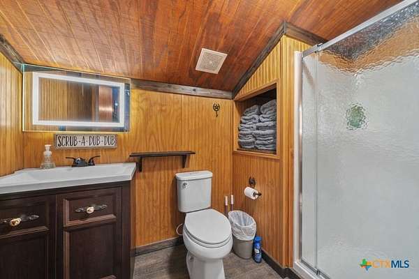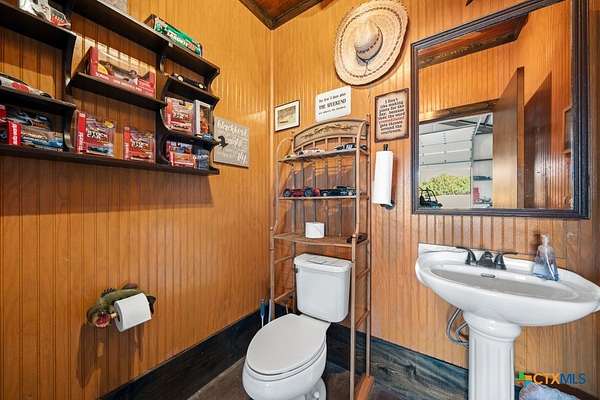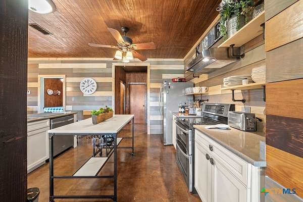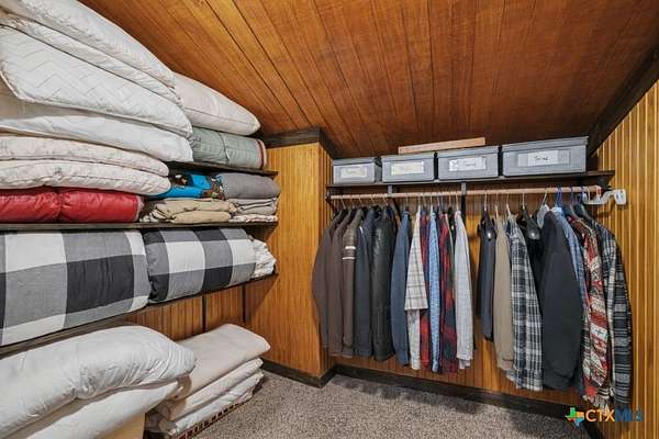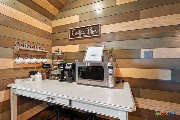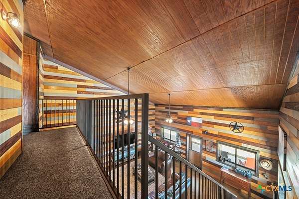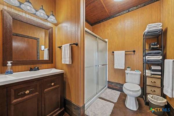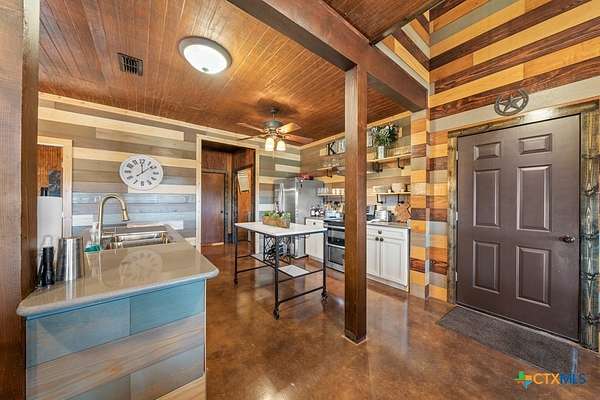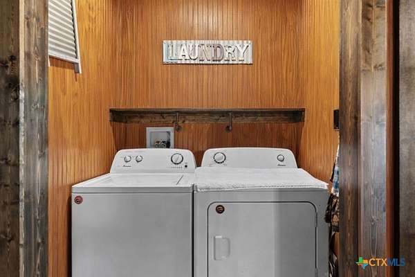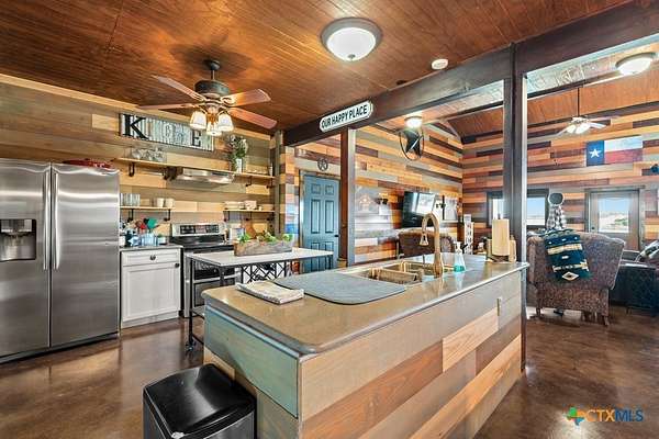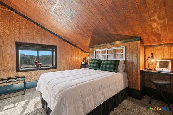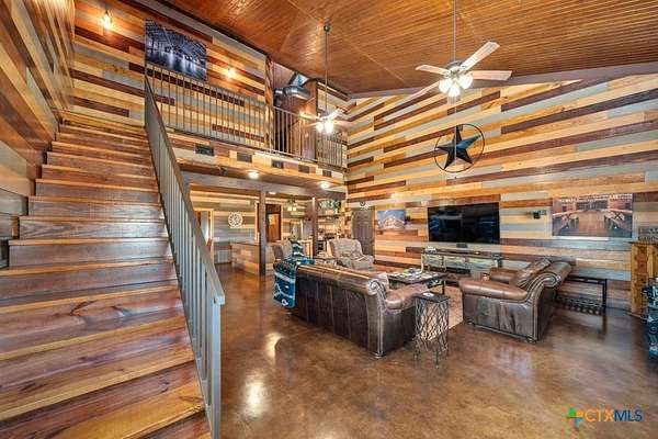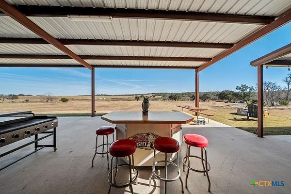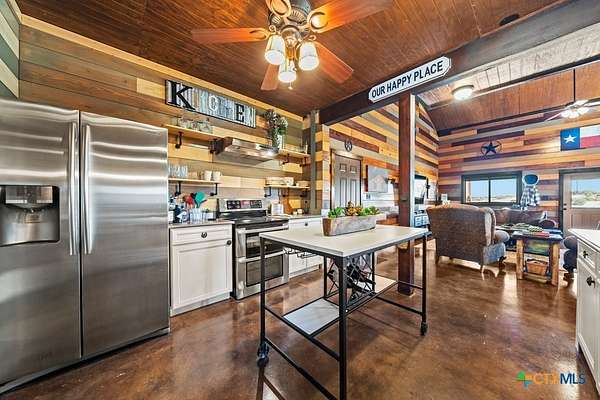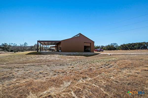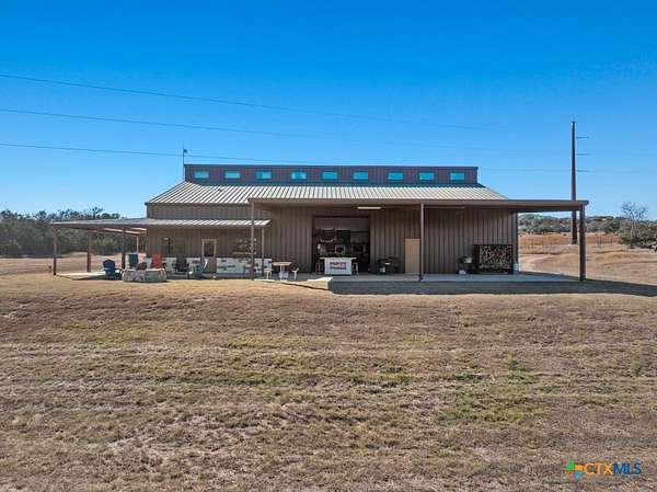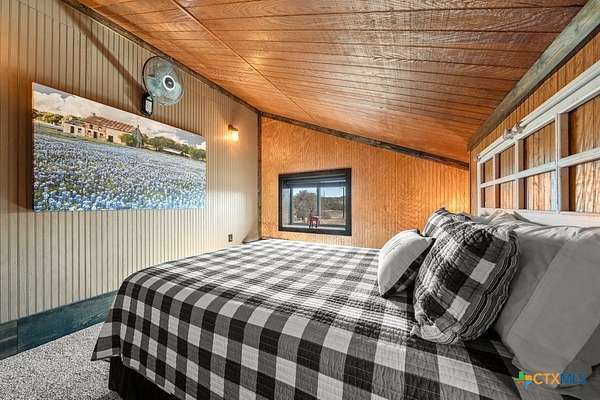 Hunt at sunrise, hit Fredericksburg by lunch, and gather everyone back at the ranch by sunset-this Stonewall retreat keeps both the sportsman and the shopper happy. Fully furnished and fully fenced, this 56.273-acre Hill Country property features Schumann Lake on site: a private 26-acre watershed reservoir shared by only a few neighboring owners, with 11 acres of lake surface included. A fresh gravel entrance with culvert pipes, recent cedar clearing and native-grass shredding, plus trails cut for ATVs set the stage for easy ranch days. Wildlife exemption in place, and a recent appraisal reflects value with the lake full and with lower water levels. The 2-story barndo offers 4BR/2.5BA, 2,270 SF living plus a 1,250 SF wrap-around porch and fire pit. Inside, vaulted great room with reclaimed-wood plank walls, stained concrete floors and big-view windows; warm kitchen with stainless appliances, open shelving, large island and coffee bar. A walk-through closet with in-closet washer/dryer leads to the downstairs primary suite. Upstairs, the loft includes 3 bedrooms, a full bath, great closets, and tons of storage while sleeping many family and guests-overlooking the great room while keeping guests private. Custom stair/railing adds safety. Attached 2,339 SF party-barn/garage is double-insulated with a 20' peak, 9 celestial (skylight) windows, two oversized doors, built-in bar, pool table, arcade stations, half bath and abundant storage; more room for toys. Plus a 600 SF caliche-based pole barn, and dock. Improvements include an on-site well, sprinkler system, septic, water heater, water softener and 2 HVAC; double-pane windows and 6" insulation in the living space. For the hunter: prime habitat for whitetail, turkey, dove, quail & hogs,plus the area is known for free-ranging axis deer. Just 25 min to Fredericksburg, 10 min to Garrison Brothers Distillery, and 20 min to lunch at Red Bud Cafe in Blanco making this retreat perfectly positioned for cherished memories.