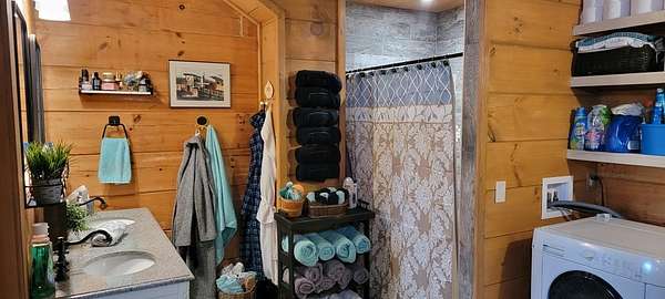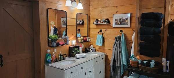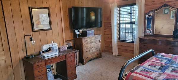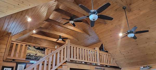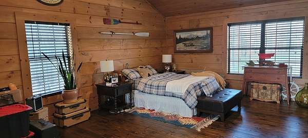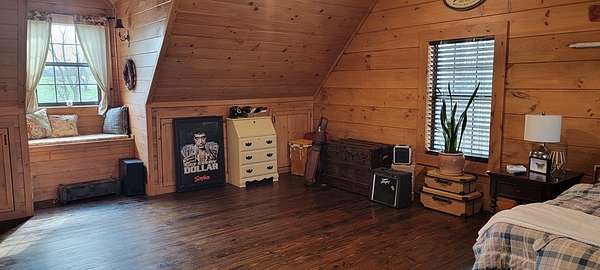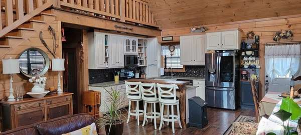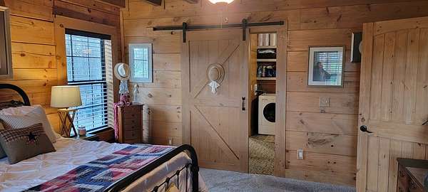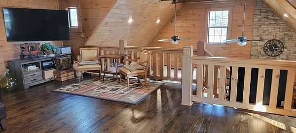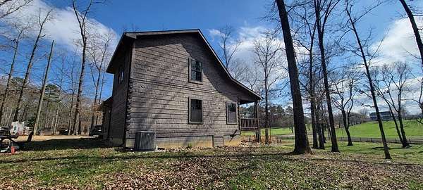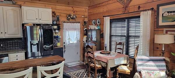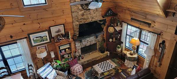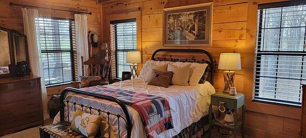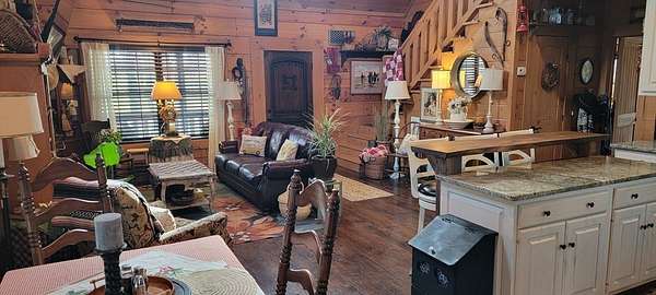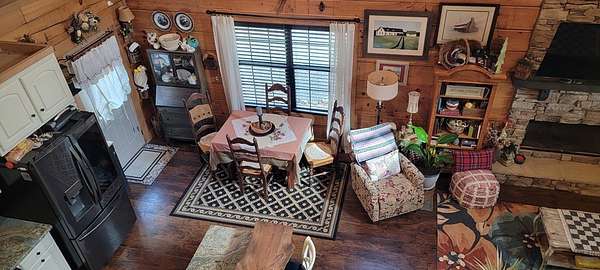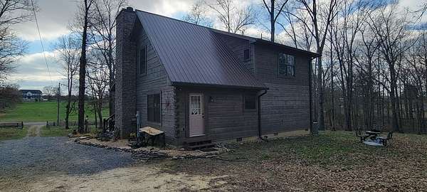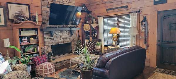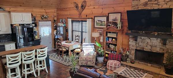 Welcome to this beautifully crafted custom log cabin built in 2020 and tucked away on 4 acres of gently sloping land. The home's inviting design immediately draws you in with a wide covered front porch. Inside, you'll find an open floor plan with high ceilings and recessed lighting that creates a warm, airy feel throughout the main living area. The living room features a wood-burning fireplace for cool evenings; prepare meals in the kitchen featuring stainless appliances and a layout that flows easily from room to room. This comfortable cabin offers 2 bedrooms and 1.5 bathrooms across two levels, including a generous walk-in closet for extra storage. Central heat and air ensure year-round comfort, while the metal roof provides long-lasting durability.
