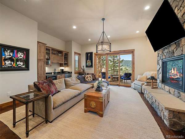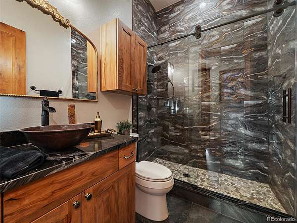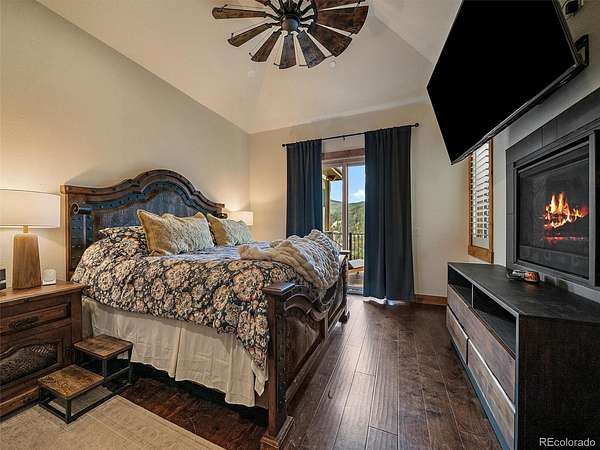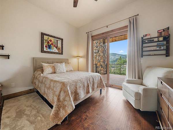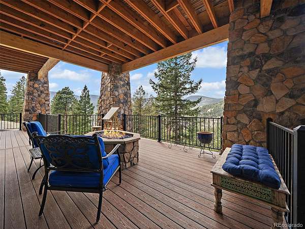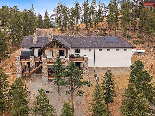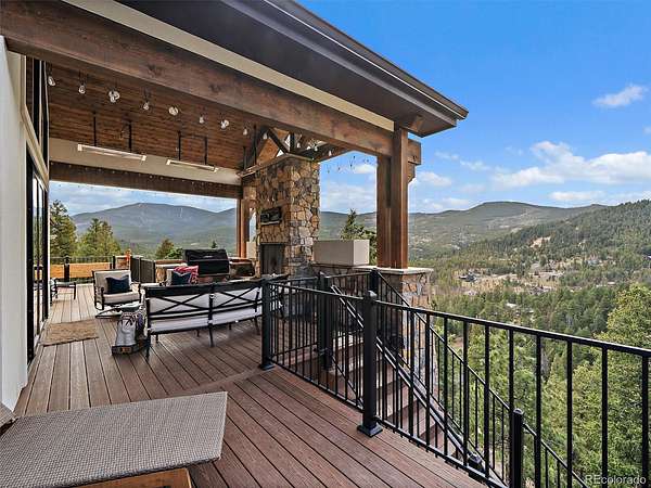 The finished walkout lower level adds three additional bedrooms, including one non-conforming bedroom currently used as an office with a Murphy bed, plus a large rec room with wet bar and access to lower-level outdoor living. The lower level opens to an additional deck and the fenced dog run, creating flexible indoor-outdoor space for year-round use. In total, the home includes 3 interior fireplaces, along with outdoor fireplaces on both deck levels. Radiant floor heat, a tankless water heater, smart thermostat, radon mitigation system, and double-pane windows add comfort and efficiency. The oversized heated 3-car garage includes 220V service, workspace, and a dog wash. The grounds feature rock outcroppings, aspen and pine, fire mitigation, and a private yard that blends into the natural landscape. Set in Evergreen with access to Maxwell Falls and Cub Creek trails, this newly completed view property brings together modern mountain design, flexible living space, and exceptional indoor-outdoor flow.