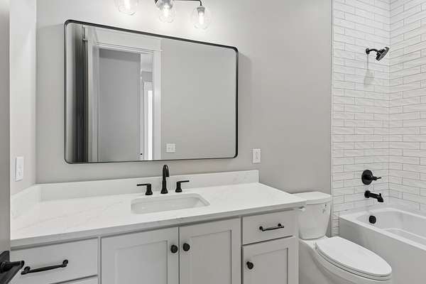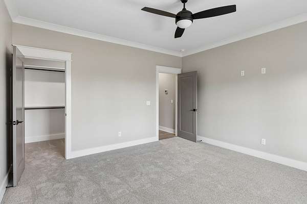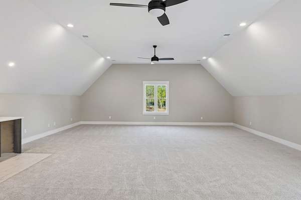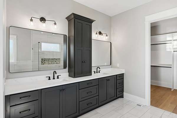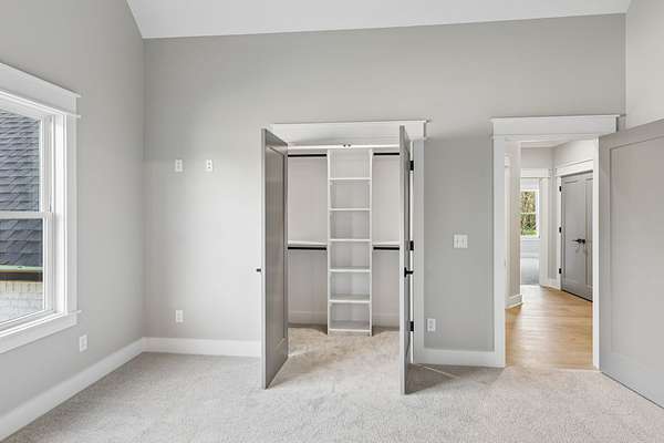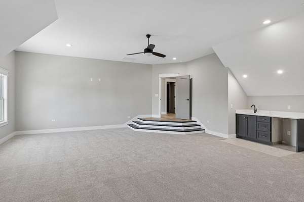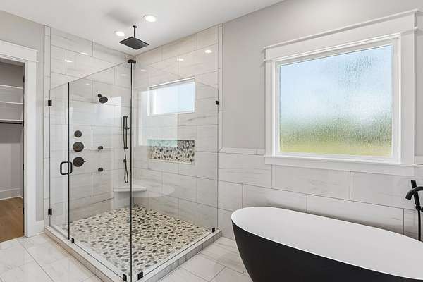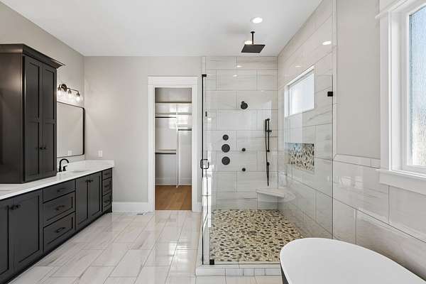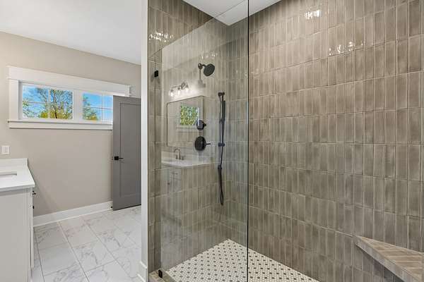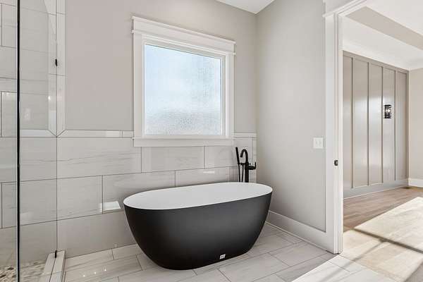 The main-level primary suite is a true retreat including a walk-in tile shower with rainhead, free standing tub, and walk-in closet. Upstairs, you’ll find more spacious bedrooms, a bonus room with a wet bar, and a gorgeous walk-in shower.