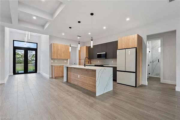 Stunning New Construction Welcome to this charming modern residence situated on a mostly upland lot, no restrictions, just peace of mind. This thoughtfully designed home with 3 spacious bedrooms, a private office, and 2 full bathrooms, combining comfort, elegance, and functionality. The open-concept floor plan is filled with abundant natural light, creating a warm and inviting atmosphere throughout the home. At the heart of the home is a custom-designed kitchen featuring premium appliances and a striking quartz waterfall island, seamlessly connected to the dining and living areas - great for entertaining and everyday living. The entire home is finished with upgraded tile flooring, delivering a sleek, modern look with easy maintenance. Step outside to your lanai, relax or host gatherings. This home also includes impact-resistant windows and doors, gutters, sprinkler system, 6-inch baseboards, upgraded tile selections, and countless additional upgrades - truly too many to list. This exceptional property blends style, durability, and modern design, making it a standout choice for today's buyer. Photos are from a previously completed home by the same builder and similar finishes. Don't miss your opportunity to own this beautiful new home