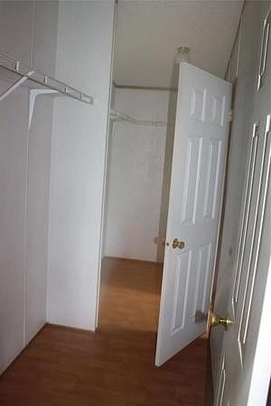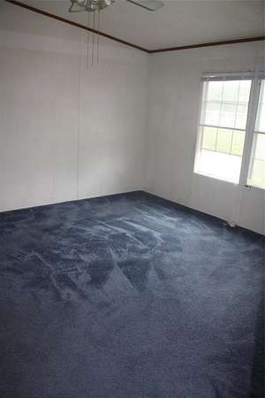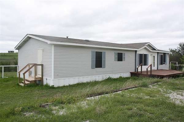This 3-bedroom, 2-bathroom mobile home sits on a large lot and features a split floorplan, with the master bedroom separated from the other bedrooms. The home includes a living area with a fireplace, kitchen, and dining space, and an open yard surrounds the property.