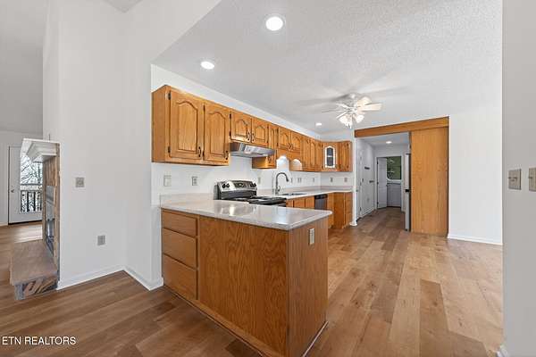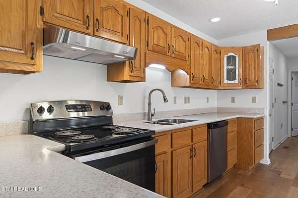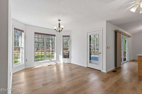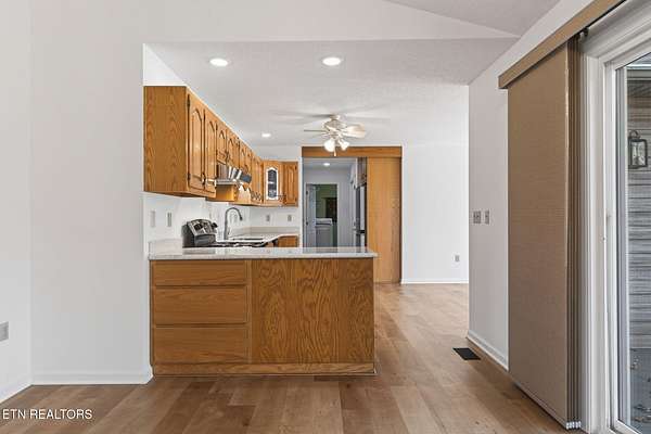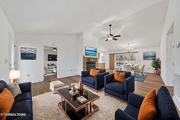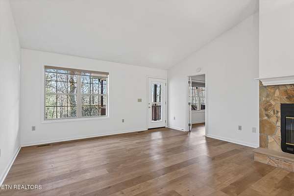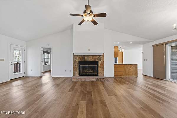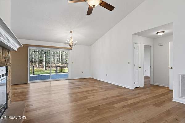 - Vaulted ceiling in the living room o Stone gas log fireplace with blower o 8' vinyl sliding door for abundant natural light o Sliding door opens to an updated Trex deck o 7'' waterproof LVP flooring throughout entire home (professionally installed in 2021) o Main living areas freshly painted (12/25) o Kitchen (Remodeled 2019) o New base cabinets with soft-close drawers o Solid surface countertops o Stainless steel appliances include: