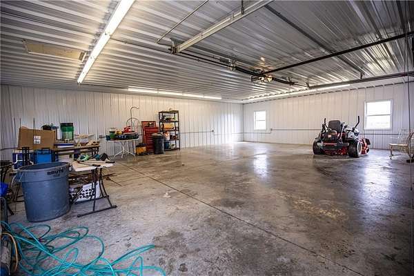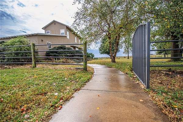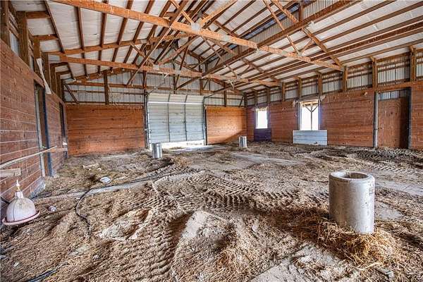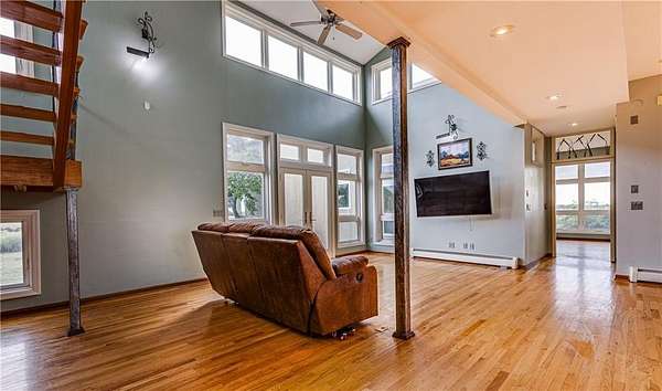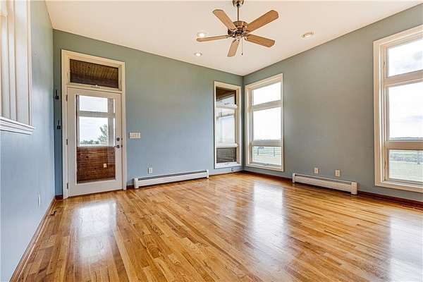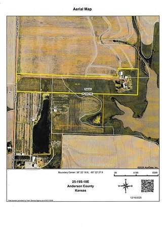 Sitting at the end of a nearly half mile driveway is this unique, 2985 square foot, 3 bedroom, 2 bath, 1 story home on 20 acres, more or less, in Anderson County, KS. You'll find an open floor plan which includes a huge master suite wing that is connected to the main body of the home by way of a large office which could be used a library, home school room or family room. Off that suite is your own private sun room in which you will enjoy picturesque views of the countryside and neighboring lake. The main body of the home is wide open with the kitchen, dining and family rooms designed for easy communication and entertaining! The upstairs includes two large bedrooms with a large bathroom. You'll love the hard wood floors throughout and everywhere you look there are windows, lots of windows. Natural light flows in abundance. The home sits on a full unfinished basement ready for your finishing touches or storage. There is a nice 60 x 60 metal horse barn and a nice 30 x 40 metal detached garage/shop! The map is for general reference only and may not reflect exact locations or dimensions. Taxes TBD. Aerial map, created with Surety Pro paid subscription & used with permission from AgriData, Inc. The map is for general reference only and may not reflect exact locations or dimensions.