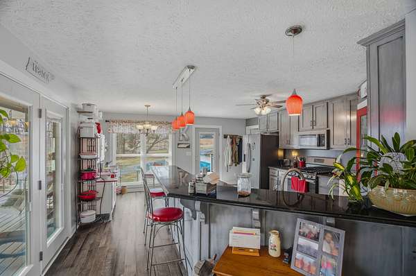 Step inside to a warm and inviting great room featuring a cozy gas fireplace, ideal for gathering on cool evenings. The dining room is surrounded by windows that flood the space with natural light while showcasing peaceful views of the creek and abundant wildlife.