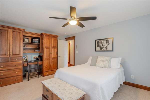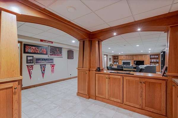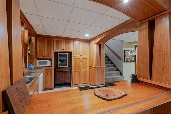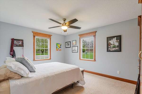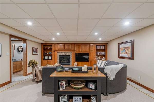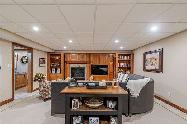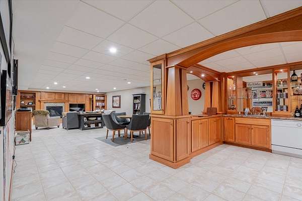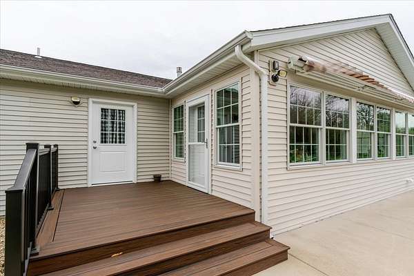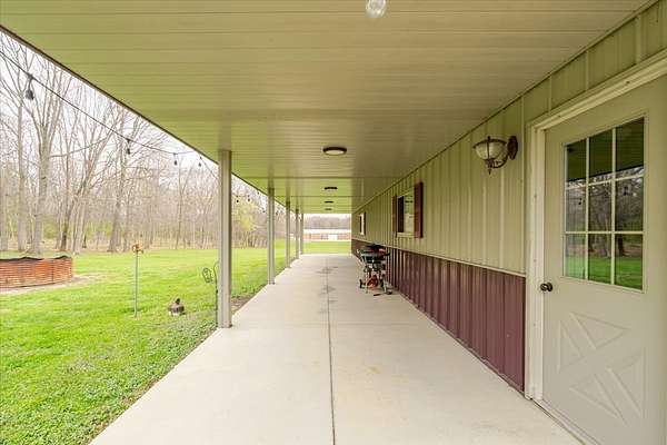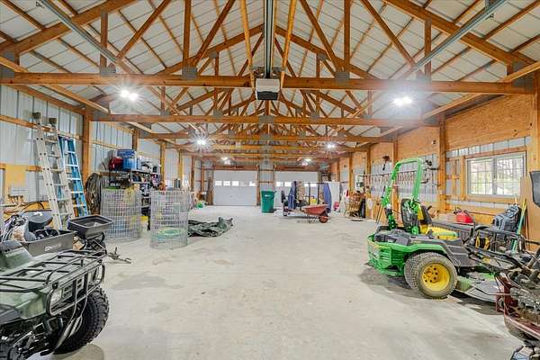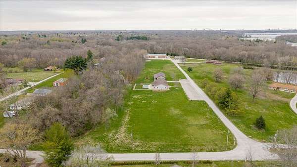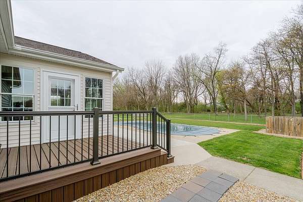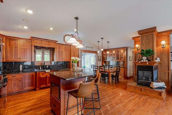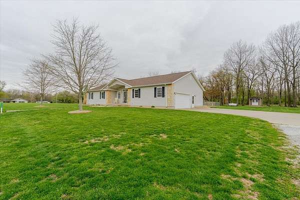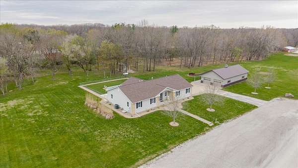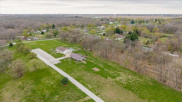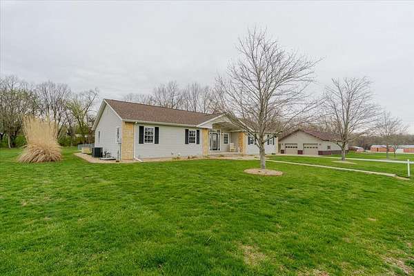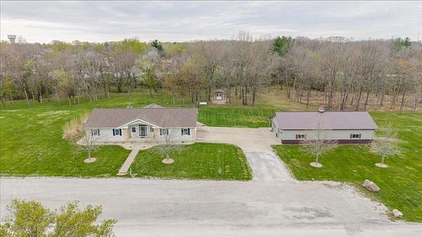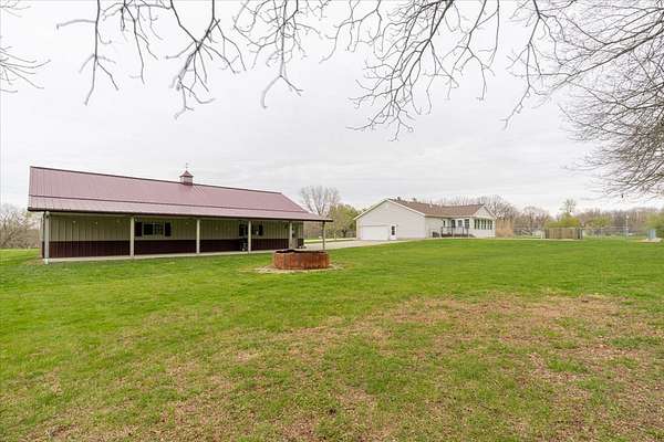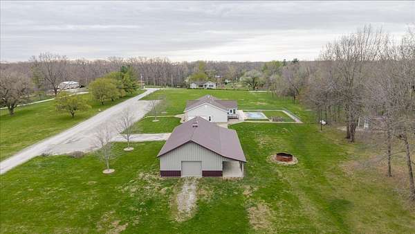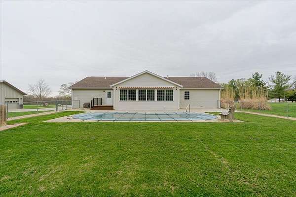 Enjoy the best of country living paired with everyday convenience! Nestled on 6.91 partially wooded acres, this retreat offers nearly 3,500 finished square feet of space inside and plenty of room to roam outdoors. The open-concept layout includes a well-appointed kitchen with a large raised island, pull-out prep station, gorgeous granite countertops, and custom cherry cabinetry. A striking three-sided fireplace adds warmth and charm to the main living area, while a second fireplace awaits in the expansive lower level. Off the kitchen, custom doors lead to a newly added, climate-controlled sunroom overlooking the inground pool, with an electric awning for extra comfort. The main floor hosts three bedrooms, including a generous primary suite with double vanities, a soaking tub, separate shower, and a custom walk-in closet. The lower level is designed for flexibility, featuring a second kitchen, a full bath, and an additional bedroom-perfect for guests or extended stays. A whole-house generator, heated basement floors, and a playhouse/cabin add even more comfort and charm. Outside, a 60' x 30' (approx.) building offers three doors, concrete flooring, and a covered patio along the entire west side. The roof was replaced in 2022, HVAC updated in 2023, and newly planted trees enhance the front landscape. This property truly is a one-of-a-kind retreat!