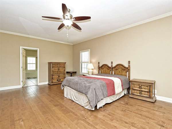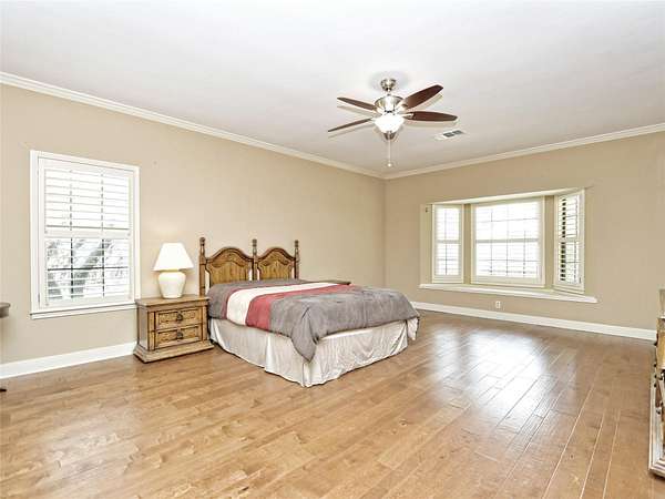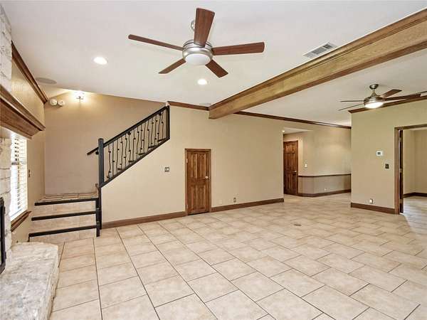 - Beamed Ceilings, Bookcases, Built-In Features, Ceiling Fan(s), Granite Counters, High Speed Internet, Interior Steps, Kitchen Island, Multiple Dining Areas, Multiple Living Areas, Natural Woodwork, Open Floorplan, Primary Bedroom On Main, Recessed Lighting, Soaking Tub, Two Primary Suties, Walk-In Closet(s)