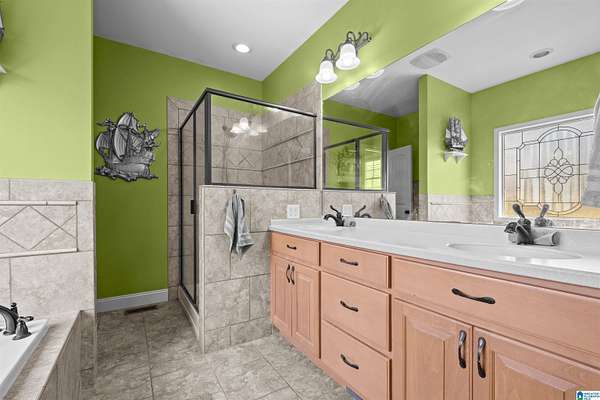 - French Doors, Garden Tub, Jetted Tub, Separate Shower, Separate Vanities, Shared Bath, Split Bedroom, Split Bedrooms, Tub/Shower Combo, Walk-In Closets
