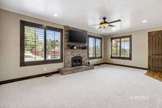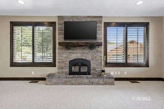 - Carpet Flooring, Ceiling Fans, Den/Office, Walk-In Closets, Window Coverings, Wood Fireplace, Wood Flooring