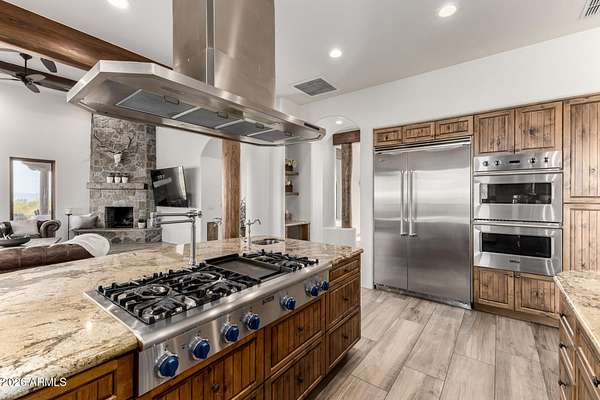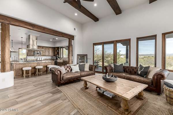 Welcome to luxury, comfort, and beautiful panoramic mountain views. The 3-car garage, huge paver driveway, and courtyard are just the beginning. You'll be stunned by the generous living and dining areas featuring soaring ceilings with exposed beams, newer flooring, high end Pella windows and doors to let in abundant natural light with fantastic views, and a floor-to-ceiling custom stone fireplace. The family room boasts a double tray ceiling, a wet bar, and direct access to the patio. The kitchen is a chef's dream, equipped with recessed lighting, custom cabinetry, granite countertops, new Viking appliances, and an island with a breakfast bar. All interior doors and wood beams are solid Alder wood to finish the custom look. The lavish main retreat hosts a fireplace, a walk-in closet for easy organization, a private exit, and a spa-like bathroom with double sinks and a separate shower & tub. Out back, you can enjoy the incredible scenery from the covered patio. Let's not forget that this gem sits on a 1.66-acre lot with horse privileges! Finally, there is spray foam insulation throughout for low energy bills. Space for your animals, toys, storage, and projects! WOW! You REALLY don't want to miss it!