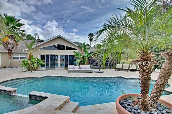 Amazing Opportunity to own a Multi-Generation Compound with three houses on 5 acres with a low assumable mortgage! A 6 Car Garage is attached to Main 3 Bedroom 2 Bathroom House. Updated Kitchen and Baths, Updated Appliances, Skylights, French Doors, Bonus Room and a covered screened patio overlooking an oversized pool and bar! RV Covered parking, 3 large metal garages and a storage container! *The Second House is a Detached 1 Bedroom 1 and half Bath that has its own driveway. The third is a converted barn that has 3 bedrooms and 1 Bath with a 4 car carport. Pond in front includes statues and garden. Mature landscaping, Fenced! Furniture in the Main House Included! The 2 additional homes are currently rented month to month. $2,800 income. No HOA. County Maintained Paved Road.
