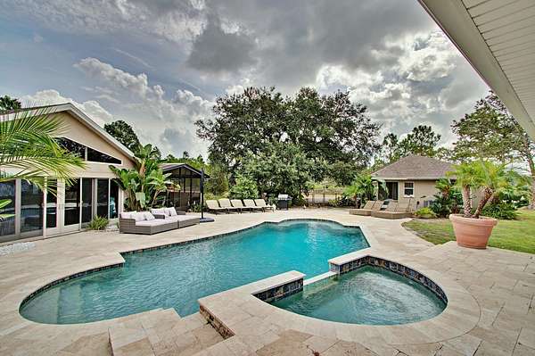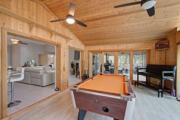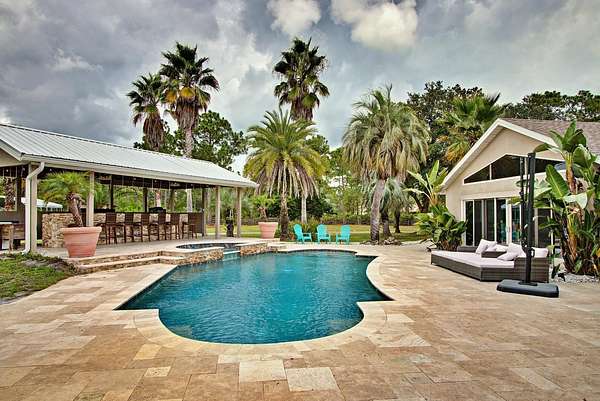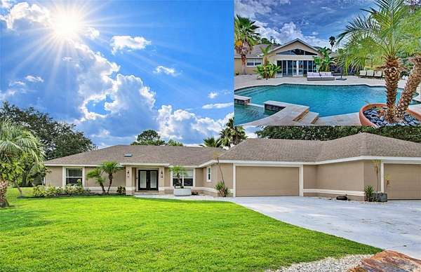 Amazing Opportunity to own a Multi-Generation Compound! 3 Houses on 5 acres with a low assumable mortgage! Consisting of 3 bed 2 bath, 1 bed 1 and half bath and a 3 bedroom 1 bath! A 6 Car Garage is attached to Main 3 Bedroom 2 Bathroom House. Updated Kitchen and Baths, Updated Appliances, Skylights, French Doors, Bonus Room and a covered screened patio overlooking an oversized pool and bar! RV Covered parking, 3 large metal garages and a storage container! *The Second House is a Detached 1 Bedroom 1 and half Bath that has its own driveway. The third is a converted barn that has 3 bedrooms and 1 Bath with a 4 car carport. Pond in front includes statues and garden. Mature landscaping, Fenced! Furniture in the Main House Included! The 2 additional homes are currently rented month to month. $2,800 income. No HOA. County Maintained Paved Road. Generator for back up power. Plenty of storage. Horse friendly!