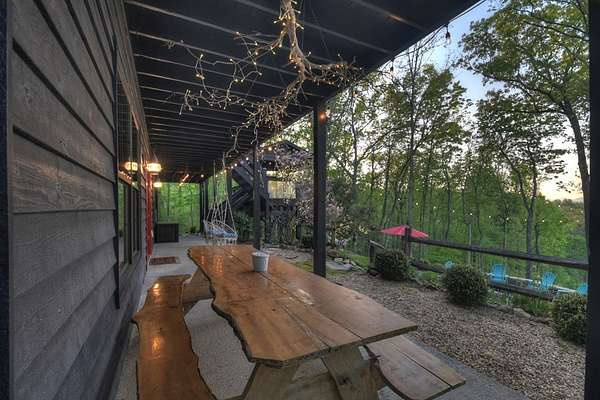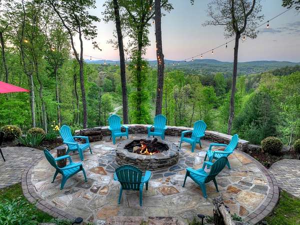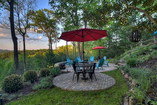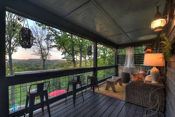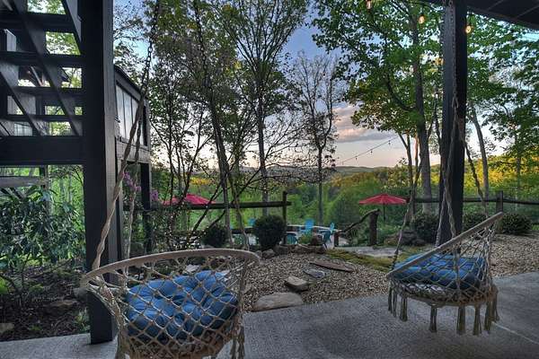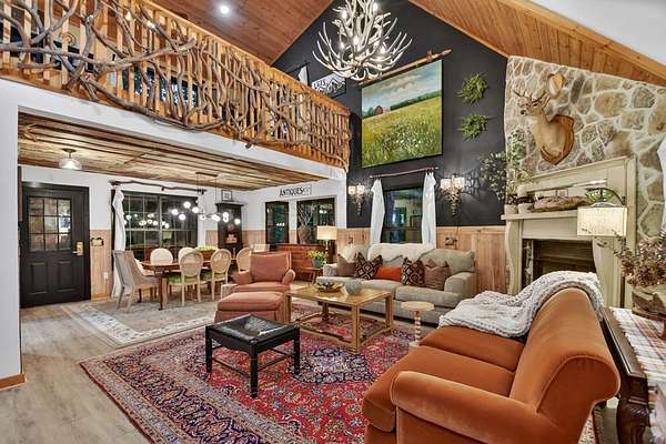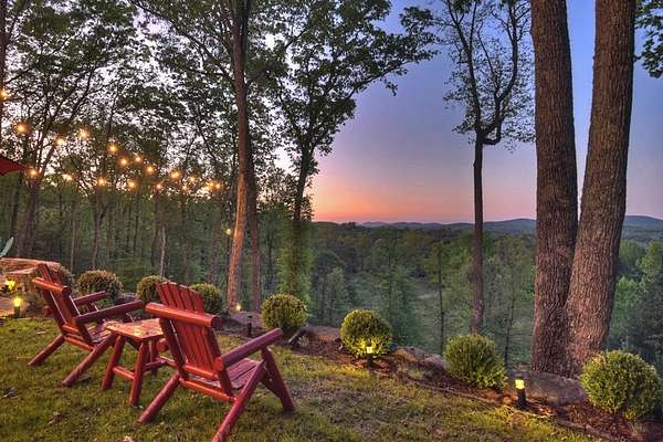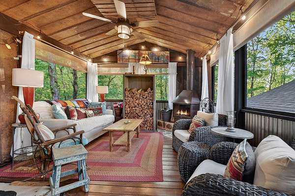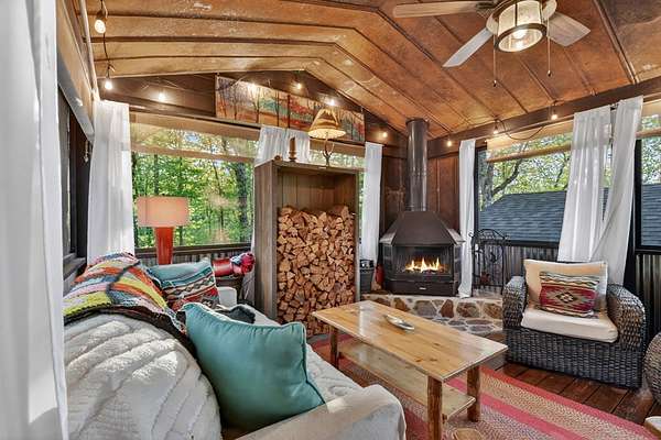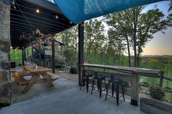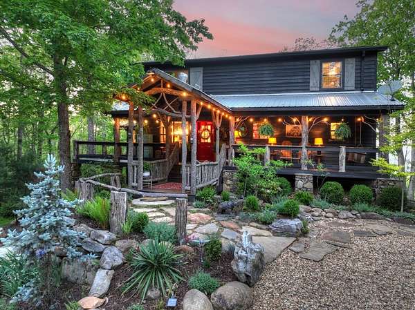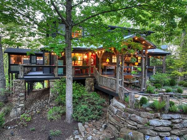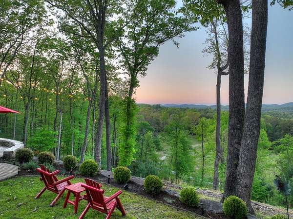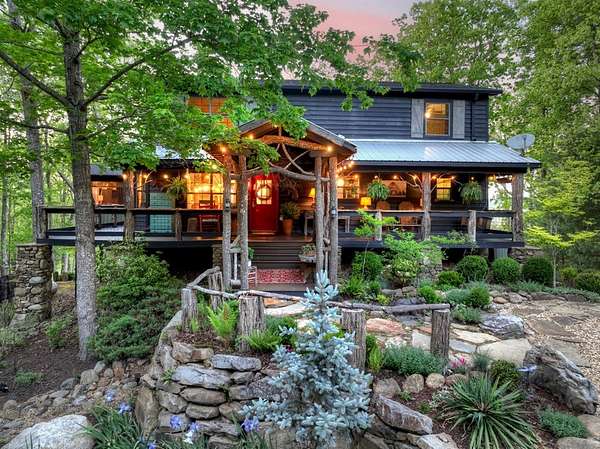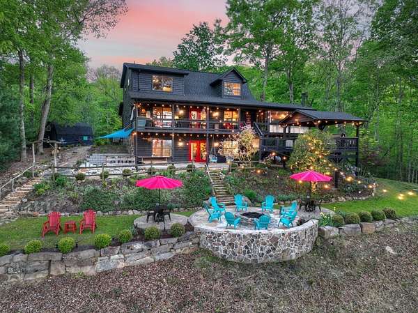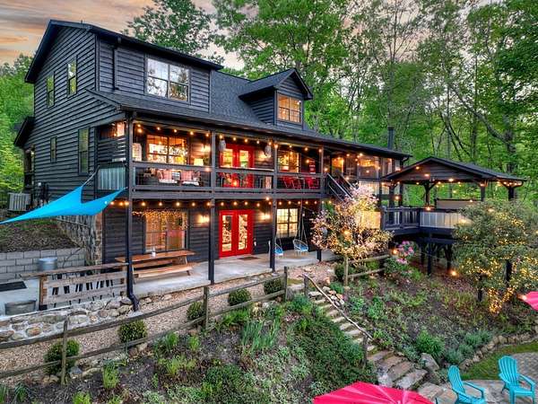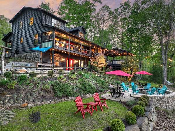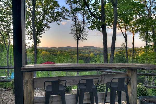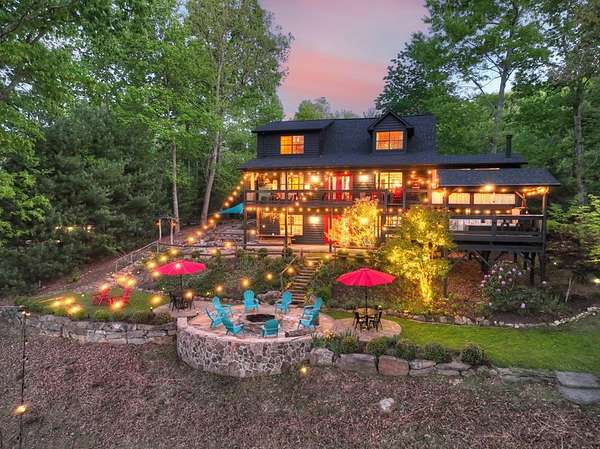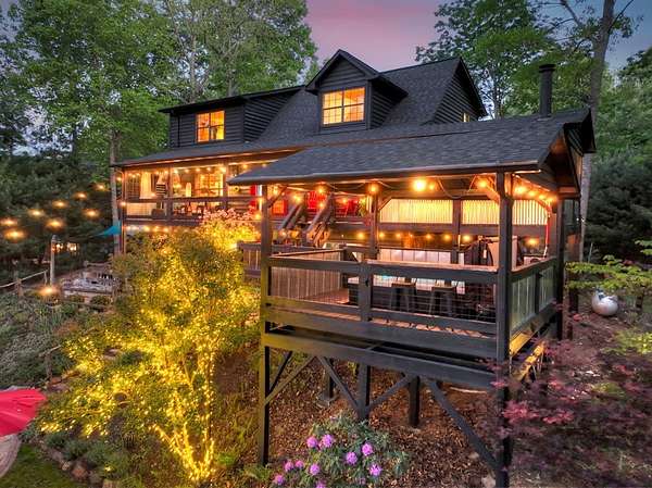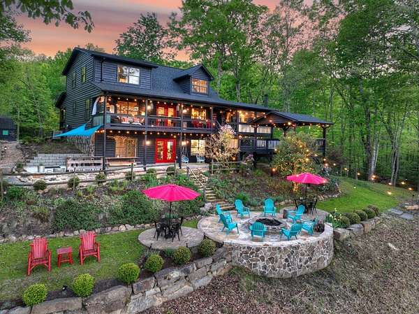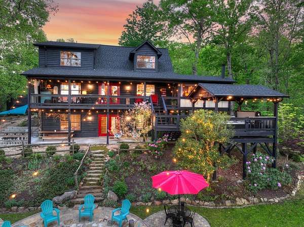 Welcome to 329 Robinson Thomas Road—an exceptional designer retreat that feels straight off the pages of Southern Living, blending eclectic charm with rustic elegance and Highlands, NC–inspired style. This thoughtfully curated four-bedroom mountain home, complete with a bunk room or theater and expansive loft, showcases a stunning open-concept living and dining area anchored by a gorgeous stone fireplace and framed by soaring cathedral ceilings with warm, inviting accents. The gourmet kitchen is equally captivating, featuring painted cabinetry, stone countertops, and timeless character throughout. Step outside to the wraparound deck and discover the true showpiece—the screened-in porch with layered mountain views, complete with a fireplace, wet bar, and TV lounge designed for year-round enjoyment. The main level offers a serene primary suite with ensuite bath and laundry, while upstairs hosts two bedrooms with a shared bath. The terrace level is built for entertaining, featuring a spacious den with fireplace, full wet bar, additional bedroom, bunk room or theater, and walk-out access to a beautifully hardscaped fire pit area under the stars, along with a covered jacuzzi porch perfectly positioned between levels. Surrounded by established designer landscaping, enhanced with low-voltage lighting, and offered fully furnished with refined interiors, this home delivers a seamless blend of luxury, comfort, and style—just minutes from Downtown Blue Ridge, Lake Blue Ridge, and Blairsville.
