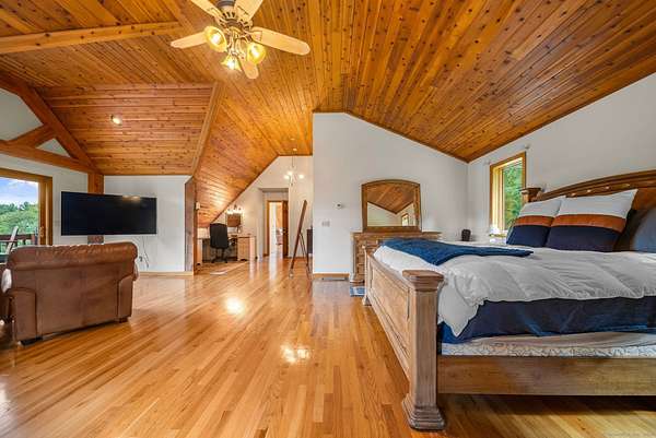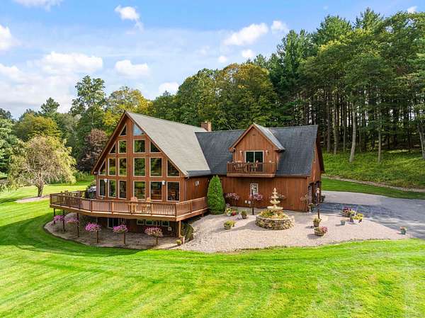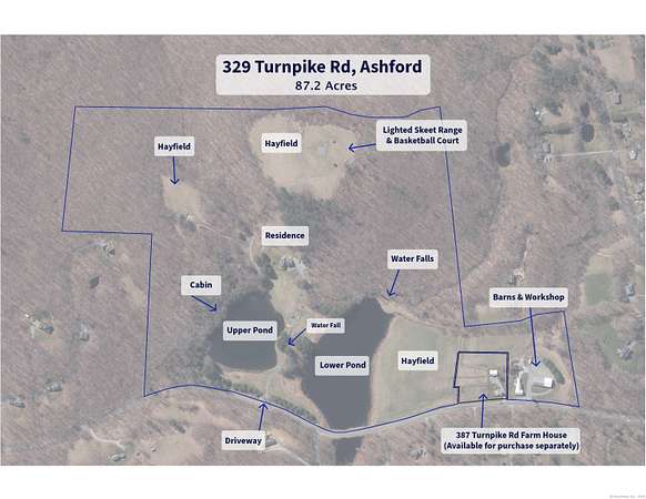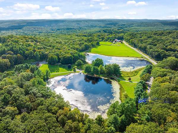 Once-in-a-lifetime opportunity to purchase an estate such as this! A truly remarkable property offering 87.2 acres of natural beauty and endless possibilities. As you approach, you'll be greeted by a scenic driveway framed by stone walls, two sparkling ponds and waterfall, setting the stage for the breathtaking home that overlooks the water. This property boasts two versatile barns, approved for business use, including a scenic New England dairy barn, perfect for storage, livestock, and workshop space. The grounds are impressive, with working hayfields, expansive stone walls, babbling brook, two ponds stocked with fish, an abundance of wildlife, and irrigation system. For leisure and entertainment, enjoy a private basketball court and a fully lighted skeet range, boating and fishing in the ponds, a campout at the pond side cabin, and maintained trails that meander throughout the wooded acreage, perfect for hiking, horseback riding, or ATV adventures. With its blend of natural beauty, privacy, and recreational amenities, this property is ideal for those seeking a private estate, family compound, winery, weddings, farm, or the ultimate retreat. Check out the link to the video of the property!