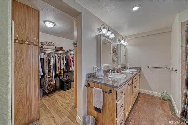 The primary bedroom/bath on the main floor has a granite double vanity with hickory cupboards and a spacious walk-in closet.