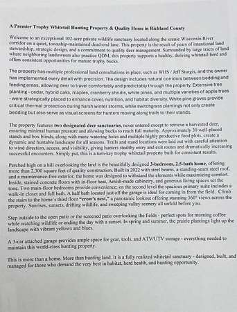 Private Wildlife Sanctuary! Experience 102 acres of prime whitetail habitat at the end of a quiet Richland County lane. With multiple professional land consultations in place such as WHS, Jeff Sturgis & Tibbets ultimate habitat, this property features strategic food plots, tree plantings, native grasses, stand sites, trails, and water holes - engineered to grow & hold Trophy Deer! You will be awestruck by the commanding 360? views from the 3rd story of this 3 BR, 2.5 bath home built in 2022. The 3-car garage offers space for the toys & tools! Quality construction includes steel beams, Amish cabinetry, stained concrete floors with in-floor heat, & spacious master suite for comfort. All surrounded by large tracts of land with quality deer management, all just minutes from the Wisconsin River