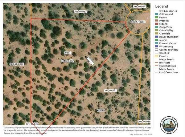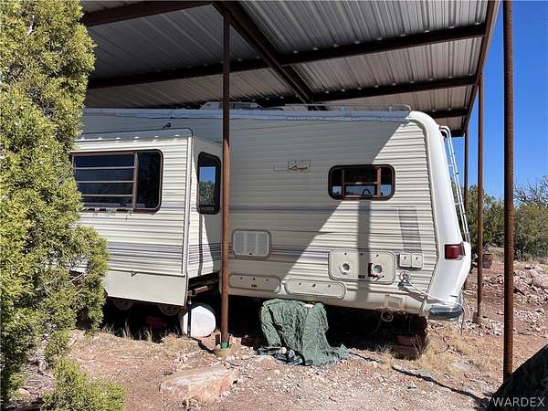 Amazing opportunity to own 2.6 acres right against 640 acres of State Trust Land. Your get-away is ready with this 5th wheel travel trailer and professionally installed HUGE RV cover to bring the outside in! The driveway and two cleared areas area already cut-in. A 100-gallon propane tank for the stove and hot water heater also convey. There's a small water tank for deliveries and a solar system set up for pressurized water. Come enjoy your glamping space with plenty of room to roam!