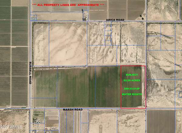 WHILE CASA GRANDE IS EXPLODING WITH DEVELOPMENT, HERE SITS AN AMAZING OPPORTUNITY TO INVEST IN THIS 52.29 ACRES (APPROX) JUST 2 MILES SOUTH OF INTERSTATE 8. PROPERTY HAS IRRIGATION WATER RIGHTS. ELECTRIC RUNS FROM MARSH ROAD TO ARICA LANE ON EAST SIDE OF PROPERTY. GENERAL RURAL ZONING THAT ALLOWS PROPERTY TO BE SPLIT. ATTESA ULTIMATE MOTORSPORTS COMMUNITY IS UNDERWAY JUST 2 MILES EAST. VISIT ATTESA'S WEBSITE TO LEARN MORE. LUCID MOTORS IS APPROX 5 MILES TO THE NORTH EAST ON THORNTON ROAD. SELLER MAY CARRY WITH RIGHT OFFER. SELLER MAY NEGOTIATE WITH CASH OFFER.