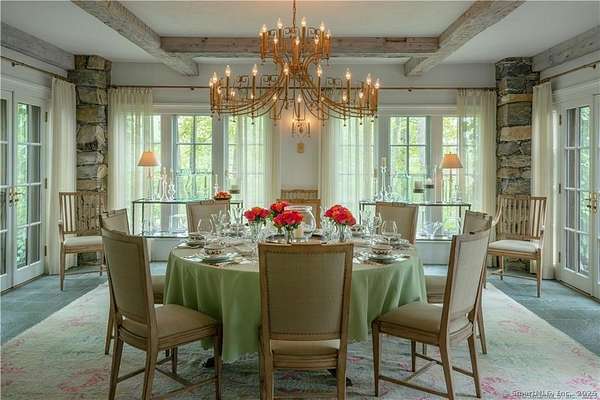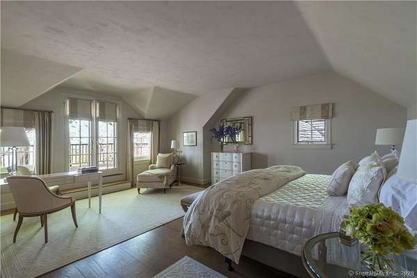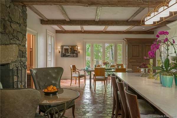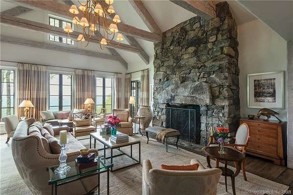 West Wind Hill, a bespoke country estate on 389 acres sits on the crest of a plateau overlooking panoramic protected views. Classic stone and shingle manor house with formal courtyard sited perfectly to experience spectacular sunsets and fairytale mists combined with the upmost in privacy. Access is via a private gated road that winds through trees, past old stone walls with glimpses of open meadow, and serene pond. Spacious rooms perfect for entertaining include a great room with a soaring peaked ceiling and a 20' stone fireplace, sun-filled formal dining room with three exposures, huge Chef's kitchen with a massive stone fireplace and adjoining catering kitchen. Beautiful reclaimed chestnut floors, exquisite detailing and banks of windows and French doors. The paneled library, office and primary bedroom suite are located on the first floor in a private wing of the house. Billiard room, complete with mini-kitchen, full bath and adjoining guest bedroom. Second-floor primary guest room with soaking tub and deck with views. Two bedroom suites with en-suite bathrooms, charming bedroom and an office complete this floor. Lower level with a media room, half-bath, wine tasting room and wine cellar with adjoining prep kitchen. Laundry room, craft room and gym. Beautiful stone steps lead to a stunning pool & pool house with full kitchen & tennis court. Two building maintenance court contains a pumping system for irrigating the lawns and gardens.
