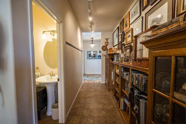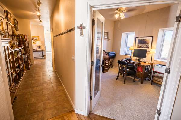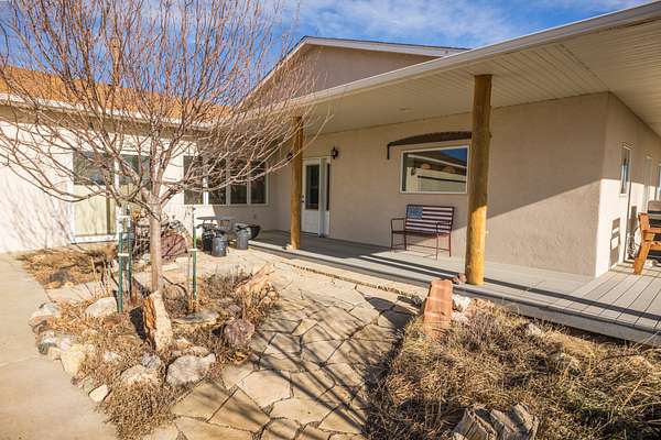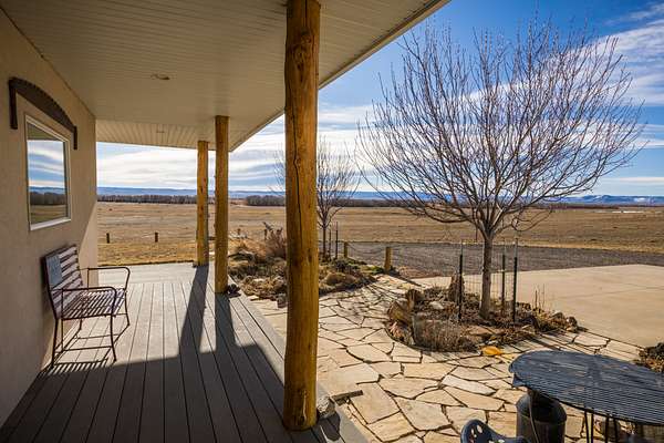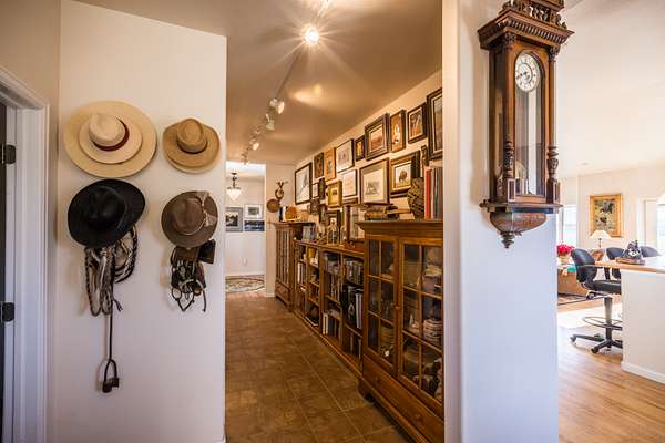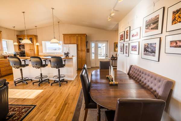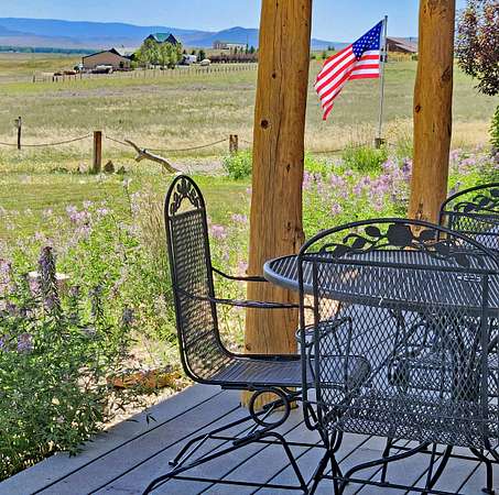 Outside, the home is anchored by a covered porch that is supported by natural log posts, creating classic ranch character and usable outdoor living space. These porches provide the perfect vantage point to take in wide-open views and Wyoming sunsets. Thoughtful landscaping, stone walkways, and mature tree and perennial plantings add charm while maintaining a low-maintenance footprint.