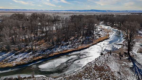 A small private stretch of the Laramie River anchors the property, bordered by mature cottonwood stands that offer natural shelter, shade, and wildlife habitat. Additional open uplands overlook the riverbed, creating a mix of pasture and lower ground.