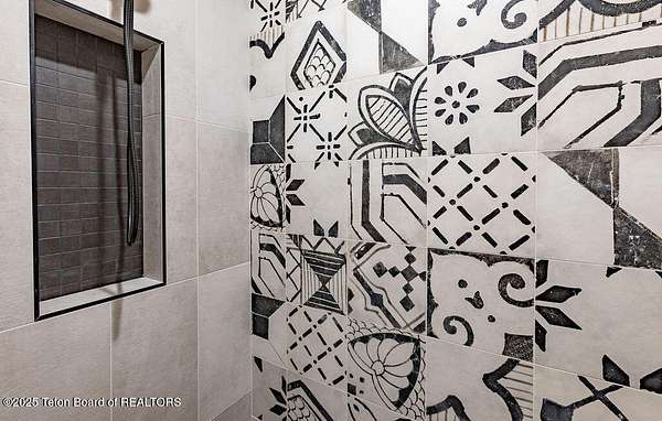 Clever design touches like custom black and gold high end light fixtures and fans in bedrooms, trending basket weave tile, impressive 3 door sliding glass porch door, raw steel beams, barn door in master, mud room bench.