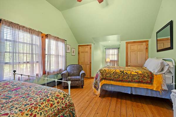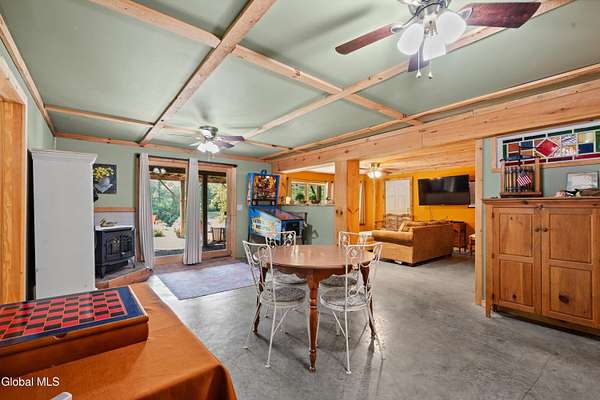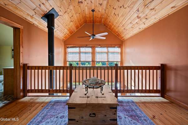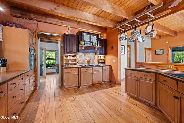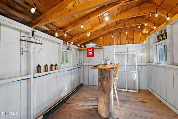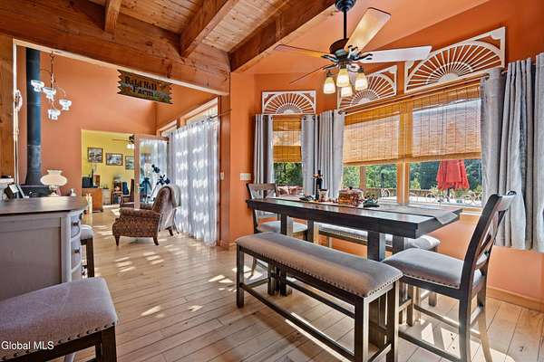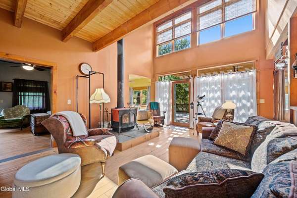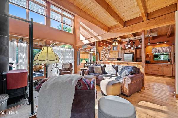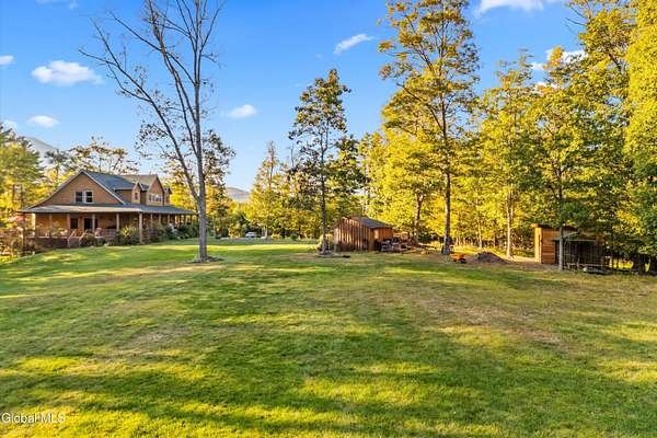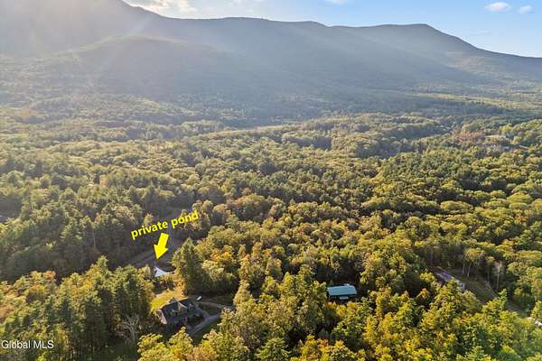An incredible escape tucked in splendid seclusion, framed by one of the most breathtaking mountain backdrops in the Catskills. The approach itself sets the tone-you wind past a private pond, up a quiet hill, and instantly feel your stress melt away. Deer often wander by, adding to the charm of this tranquil setting. This post-and-beam mountain retreat, styled as a country cape, welcomes you with an inviting wraparound porch and a soaring vaulted interior filled with exposed beams and natural wood. Every window is designed to showcase the sweeping views, making it feel like the mountains are right at your doorstep. Whether you're enjoying the glow of a winter sunset from indoors or relaxing outside on warm evenings, the scenery is unforgettable. Thoughtful details and hidden delights are found throughout the home-each discovery adding to its magic. The only way to truly capture its beauty is to experience it in person. Schedule a visit-you won't be disappointed.