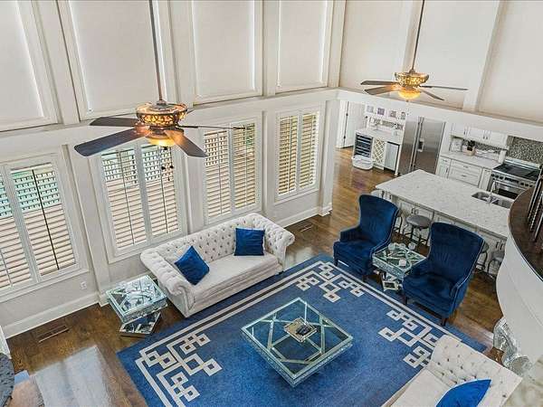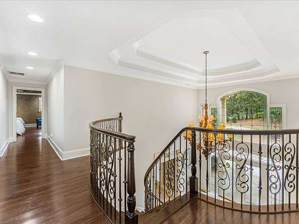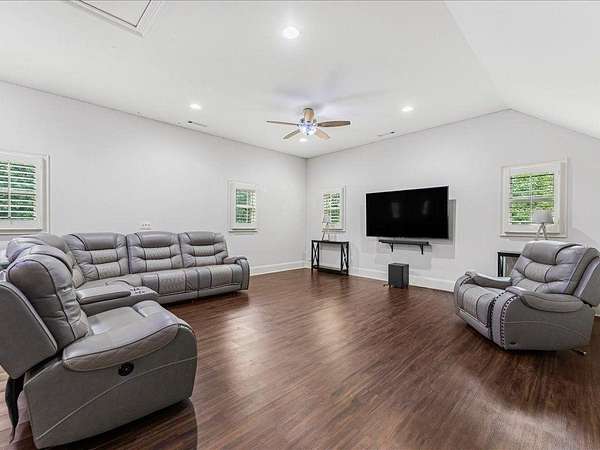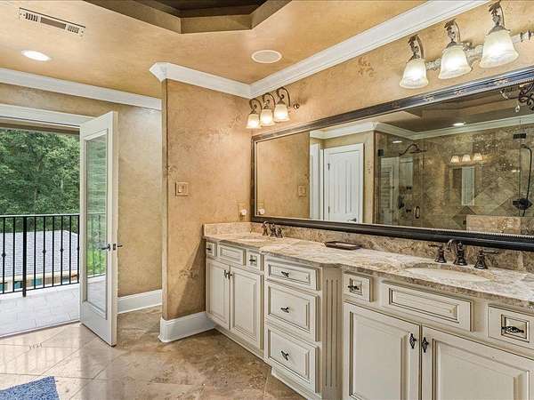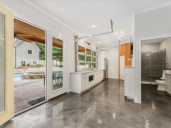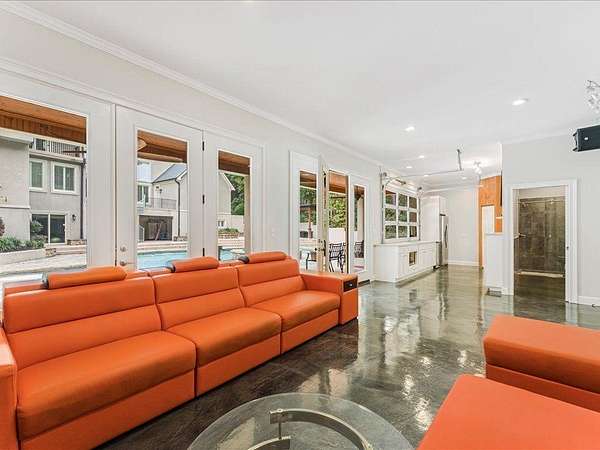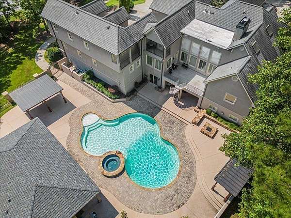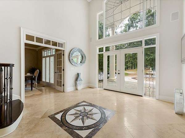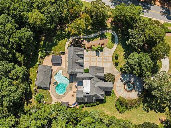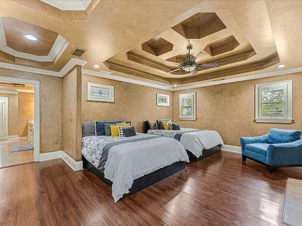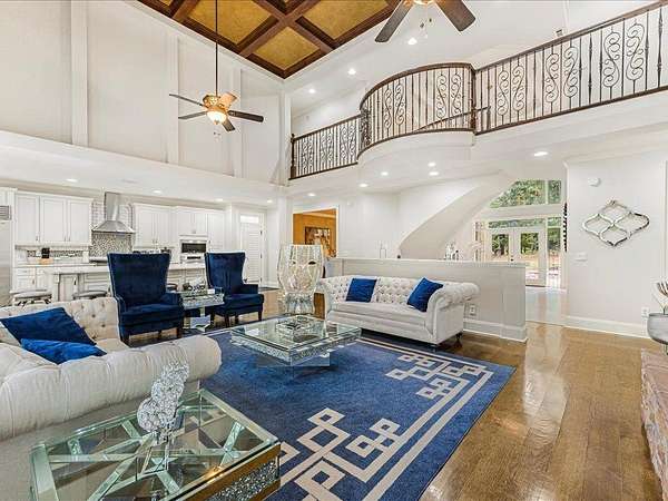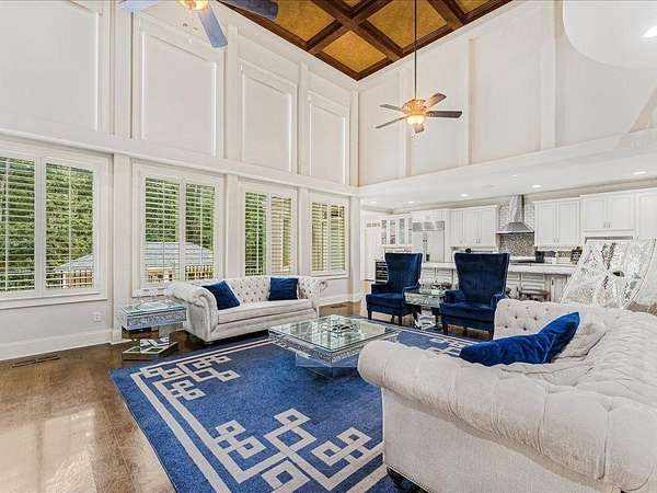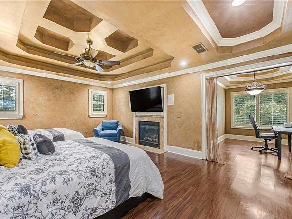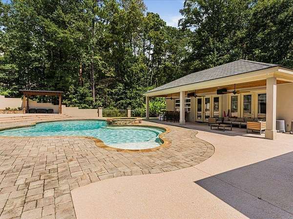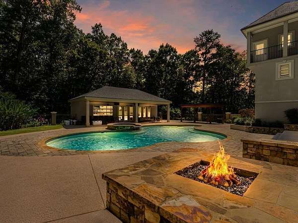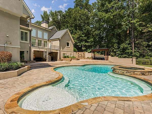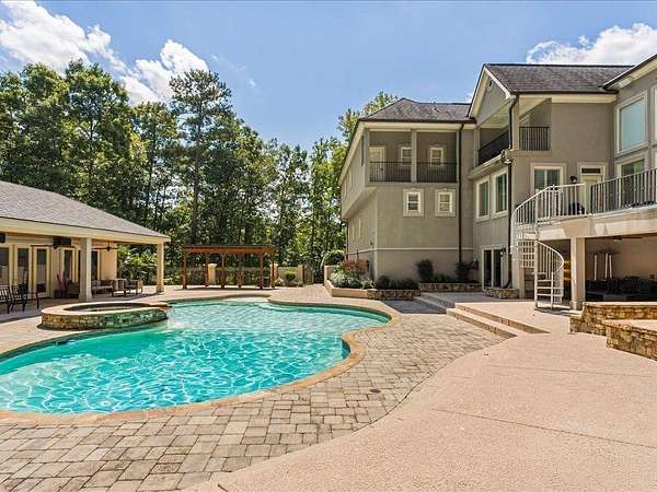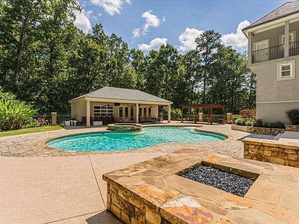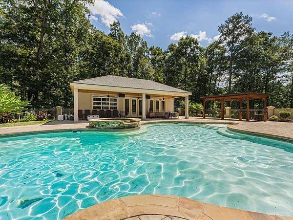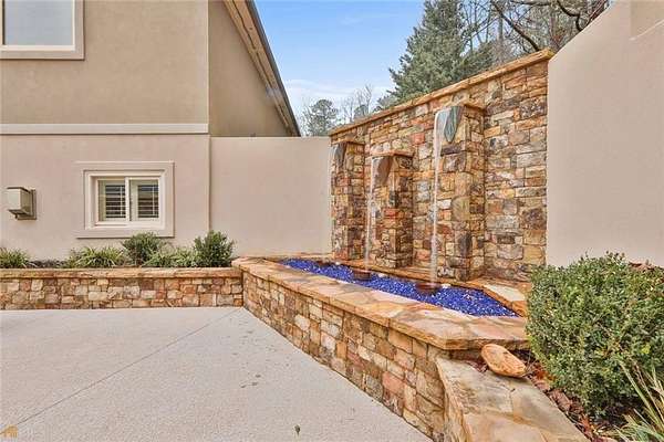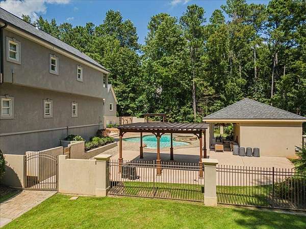 Behind private gates in one of Peachtree City's most admired locations lies a corner lot residence, that redefines luxury living. From the moment you arrive, the estate's resort-style heated saltwater pool and jacuzzi sets the tone-a breathtaking focal point surrounded by cascading waterfalls, multiple terraces, and lush, manicured grounds. Every element of this outdoor retreat was thoughtfully designed to evoke tranquility and elegance. The custom designed poolhouse offers an endless space to gather, entertain, and unwind. Whether enjoying a quiet morning by the water or an evening beneath the pergolas beside the firepit, this backyard transforms every moment into an experience. Inside, the home is equally captivating. A grand foyer opens to a dramatic three-story living room with coffered ceilings, floor-to-ceiling windows, and a striking stone fireplace-framing panoramic views of the pool and gardens beyond. The recently renovated kitchen blends style and functionality, featuring an oversized island, custom cabinetry, and seamless connection to the main living and dining spaces. The layout offers dual owner's suites-one on the main level and another upstairs with its own private laundry-ensuring comfort and privacy for all. The terrace level continues the story of refined living with an additional full bedroom suite. A winding staircase leads to a completed basement featuring a massive guest quarter, theater, spacious fitness center, as well as a full and half bath. Completing the estate is an expansive bonus apartment above the three-car garage, featuring a full kitchen and open-concept living area-ideal for guests, extended family, or a private studio retreat. Elegant, private, and designed with intention-this residence is a rare opportunity to own one of Peachtree City's most distinguished addresses, where every detail inspires and every day feels like a getaway. Enjoy more than 100 miles of golf cart and multi-use trails, along with convenient access to shopping centers and dining options. This estate is served by the Fayette County School System, "Schools are "A" rated. A MUST SEE UNIQUE HOME