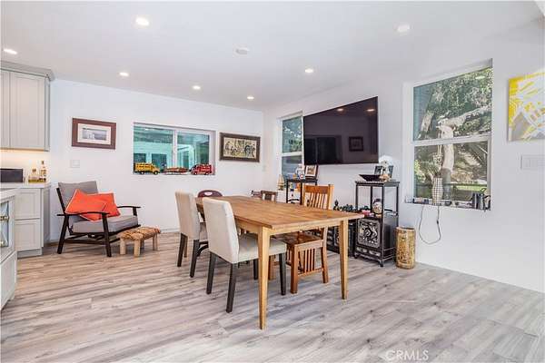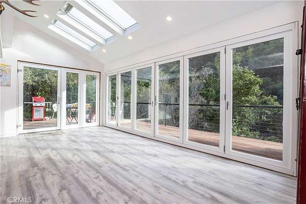 The home features light-filled interiors, an open living layout, vaulted ceilings with skylights, and flexible living spaces designed to connect with the outdoors. The property is currently configured with additional bedrooms and bathrooms without permits; buyer to independently verify square footage, room count, and all improvements.