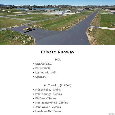 AVIATION RUNWAY AND EQUESTRIAN ACREAGE. RARE and INCREDIBLE SoCal Property: Lot 330 On PAVED Sky Harbor in the beautiful Lake Riverside Estates Community. Enter the gated 2.69 ACRE Fully Fenced parcel offering a new PRIVATE DEEP WATER WELL WITH ELECTRIC AND PRESSURE TANK. AND THE BEST PART..................DIRECT TAXIWAY ACCESS TO the 3600' lighted RUNWAY with VASI system. BONUS * COMING SOON, ADJACENT COMBINED 5+ ACRE CUSTOM MODERN BUILT STYLISH HOME WITH AIRPLANE HANGAR * This gorgeous mountain view parcel also offers planted trees lining the property including pines, mulberries and mimosas!! Located in the heart of wonderful SoCal with mild seasonal temps and higher elevation with clear skies above the hustle of the city down below. This developed parcel is located on a paved road, is completely level, and with exception to building setbacks from the edges, it is all usable and ready for your dreams. Build your private Hangar "AND" Horse Barn, custom home, gardens, and more! Located only 25 min from Temecula for shopping and dining and approx 30 min to Temecula Wine Country. Within 45 min you can enjoy Palm Desert, Idyllwild and Julian. This gorgeous community offers a 55 acre lake for bird watching, catch and release fishing, dog walking, picnics, and BBQ areas. There is a tot lot, pool, meeting/rec room, bike pump track, sports courts, and direct access horse and hiking trails in the adjacent National Forest! The community equestrian arena is a quick 2 min ride from the parcel and the lake is only a few minute walk away! This type of real estate is quite rare throughout the US but this historic aviation and equestrian community offers it ALL!!! The local pilots have created a supportive Pilot's group where likeminded enthusiasts get together and plan great fun events like Santa Fly in, air and car shows, and runway improvements. Many types of construction are allowed, and the owners recently built their own custom home and they are happy to share information on the process. A must see for the aviation (and equestrian) enthusiast!!