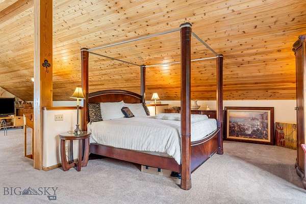 The private 20-acre getaway in Riverview Ranch offers serenity, seclusion, and breathtaking views. A full-length covered porch spans the front of the home, offering sweeping views of the south entrance to Big Sky. Step inside to a warm and inviting open-concept design, featuring expansive windows that allow natural light and breathtaking views of the Gallatin River and the Gallatin Mountain Range. The expansive deck, fenced yard, and a water feature create an idyllic setting for entertaining guests or enjoying quiet, peaceful moments. At the heart of the home, the great room features a floor-to-ceiling river rock wood-burning fireplace, along with vaulted wood ceilings. The functional kitchen is equipped with a gas Viking cooktop, double ovens, and ample dining space. Perfect for hosting dinner parties or casual get-togethers. Accommodations on the main floor, include a primary bedroom with an en-suite bath and walk-in closet, two additional bedrooms, a full bath and an office. A plus for hosting family and friends is the Bonus room with a private bath. Overlooking the Great Room, the spacious loft offers versatile space, currently used as sleeping quarters, an exercise area, and a game room. An attached two-car garage leads seamlessly into the mud/laundry room, providing a practical, functional transition from outdoor adventures to indoor living. Blending Montana Mountain living with modern comfort, this property delivers all, including elk, deer, birds, and other visible seasonal wildlife.