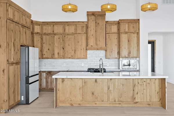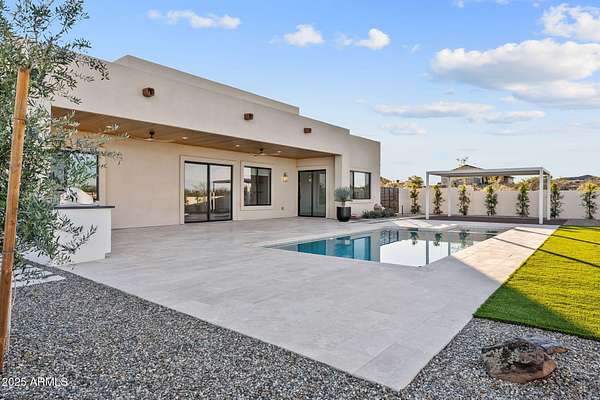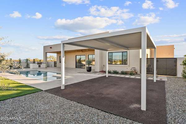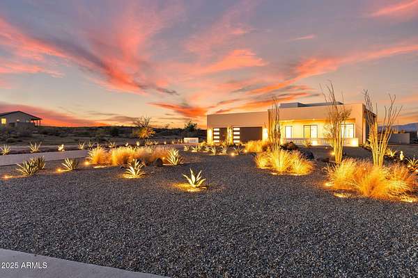 Stunning new custom home in Listening Hills featuring modern design, high-end finishes, and an open, light-filled layout. The home backs directly to protected State Land, giving you rare, permanent unobstructed views of the desert and mountains-no future homes will ever be built behind you. Enjoy a brand-new pool and spa, travertine patio, and a spacious covered outdoor area perfect for Arizona living. Inside, the gourmet kitchen offers quartz countertops, custom cabinets, and a large island that flows into the living and dining spaces. The primary suite includes a luxurious walk-in shower and private patio access. With an oversized 3-car garage and full desert landscaping, this move-in-ready home delivers luxury, privacy, and the peaceful Wickenburg lifestyle just minutes from town.
