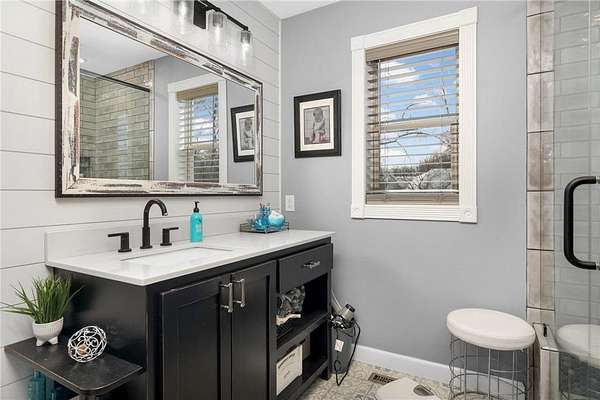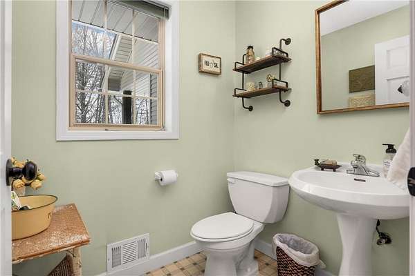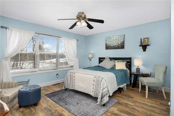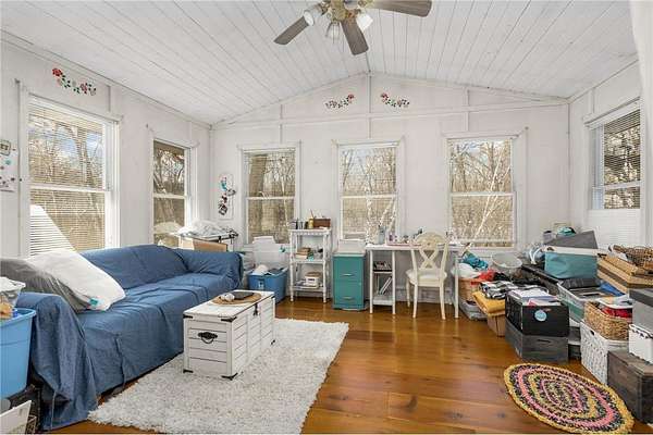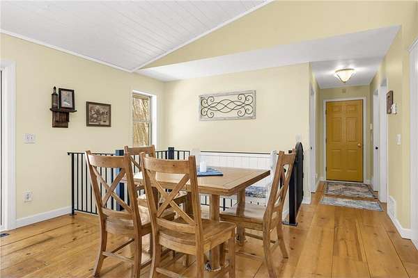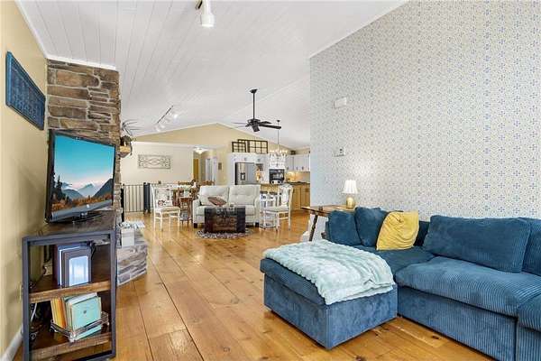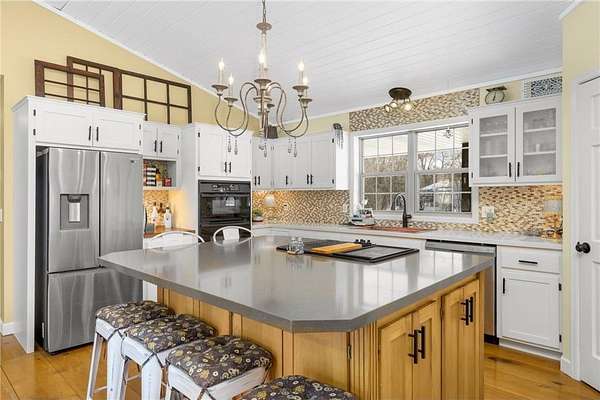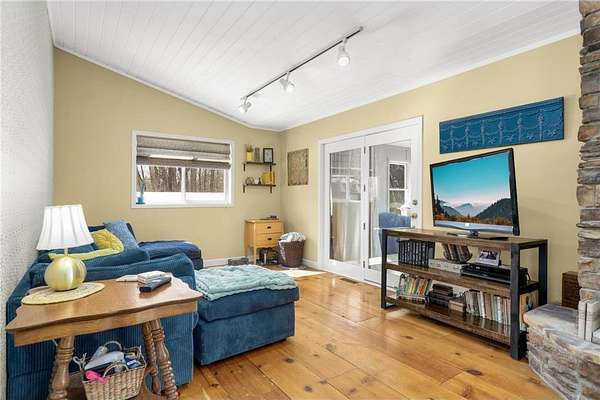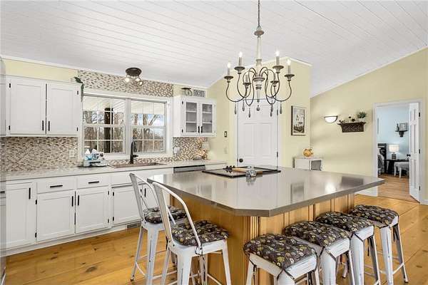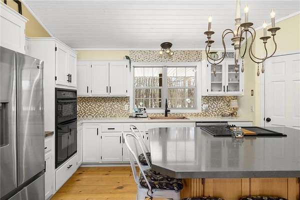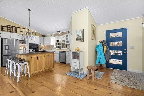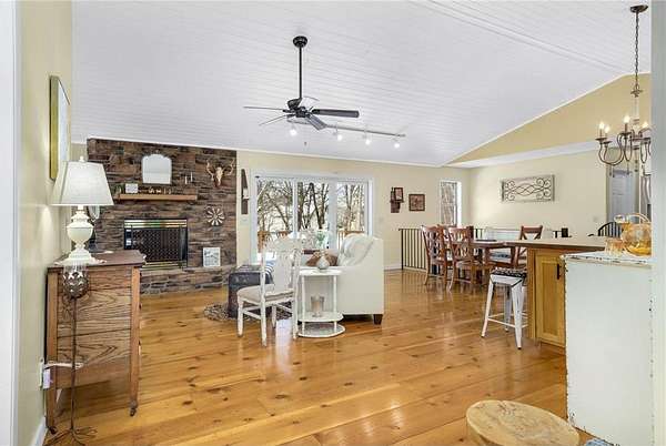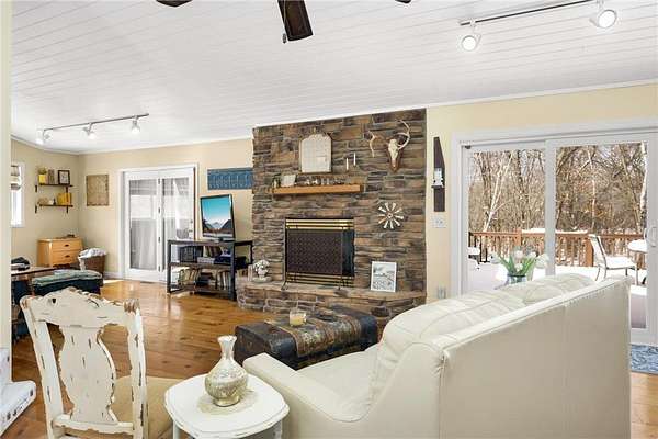 Discover this beautifully refreshed walk-out rambler, perfectly situated on 2.50 private acres. From the moment you enter, you'll be greeted by stunning real 100 year old pine wood floors, and an expansive open floor plan. The gourmet kitchen is a chef's dream, featuring a massive center island with a built-in cooktop, double oven/ microwave and a striking copper sink. The first floor laundry room has been redone,and the main level freshly painted. Retreat to the luxurious primary suite, complete with a spa-like ceramic walk-in shower and a generous walk-in closet.