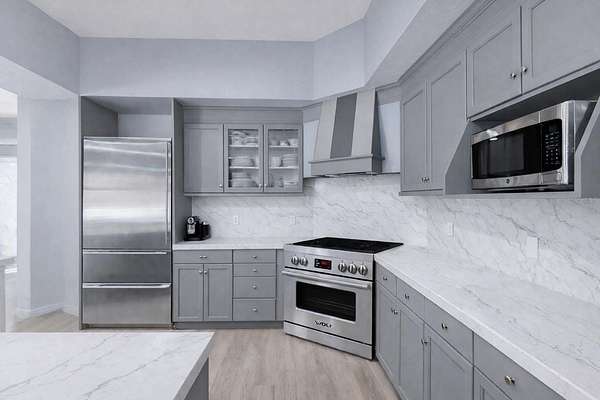 The residence offers spacious and comfortable living with a dramatic 14-foot ceiling upon entering the home, creating an immediate sense of openness and elegance. The home includes three bedrooms and three bathrooms, along with an impressive twelve closets, providing exceptional storage rarely found in residential homes.