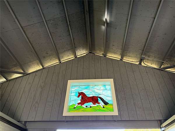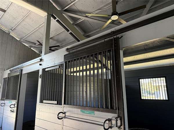 The center-aisle barn features five stalls, new LED ceiling fans with lights, adorns a stained glass horse that lights up at night, automatic fly-spray systems above the stalls, and Lutron lighting, providing both comfort and convenience for the horses.