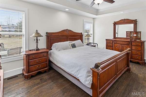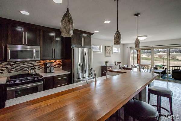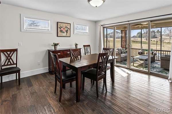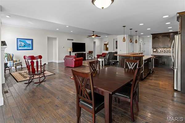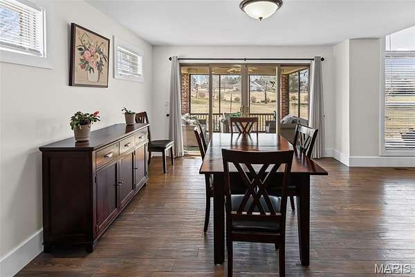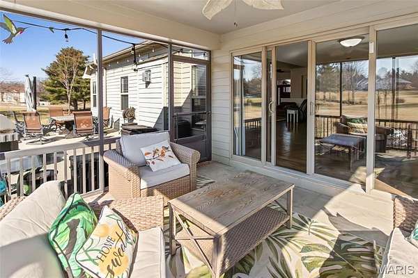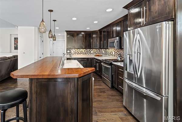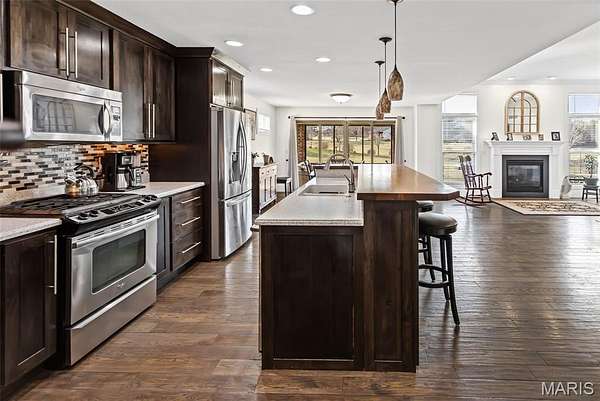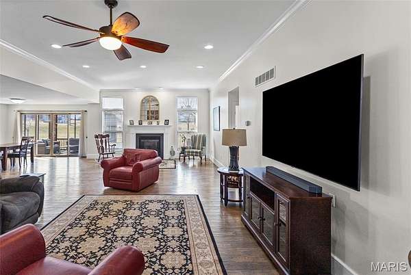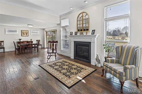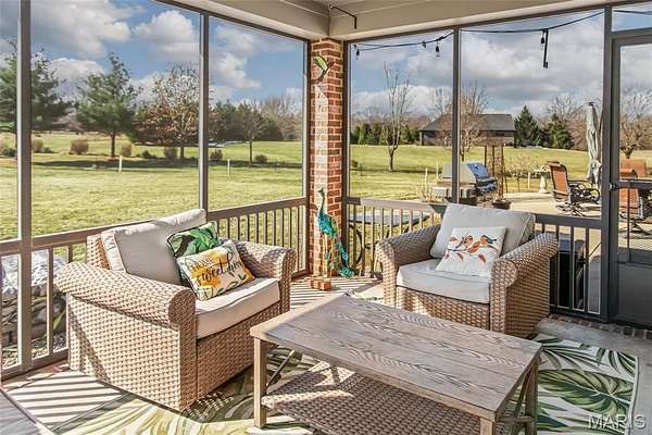 Custom-built brick ranch with stone accents on 2.2 acres in a quiet subdivision, offering over 3,000 sq ft of finished living space. This elegant home features an open-concept design with hand-scraped solid oak flooring, crown molding, and quality fixtures throughout. The living room showcases a direct-vent gas fireplace, while the chef's kitchen includes solid surface countertops, stainless appliances, beverage cooler, pantry, and large island with bar seating. The primary suite offers a walk-in closet and spa-like bath with double vanity and separate shower. Main-level laundry adds convenience. The recently finished lower level provides approximately 1,100 sq ft with a spacious family room, additional bedroom, and full bath--ideal for guests or extended living. Enjoy peaceful views from the screened-in porch overlooking beautifully landscaped grounds. Additional highlights include a 3-car garage, circular drive, workshop/storage space, and mature trees. Luxury, privacy, and space combine in this exceptional property.